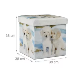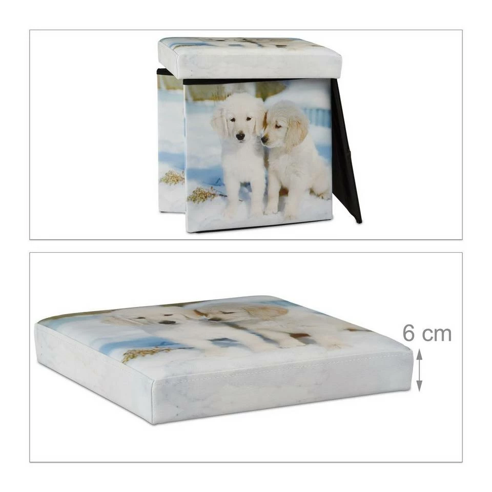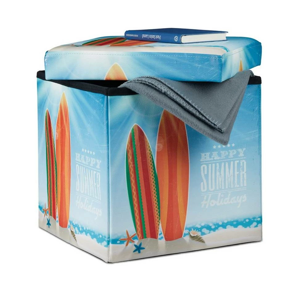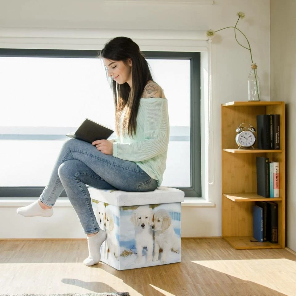 Faltbarer Sitzhocker mit Stauraum Sitzgelegenheit und Aufbewahrungsbox in Einem – das ist der praktische Sitzhocker mit Stauraum. Der faltbare Sitzwürfel ist mit wenigen Handgriffen aufgebaut. Der gepolsterte Deckel und das weiche Kunstleder bieten hohen Sitzkomfort. Der Innenraum des Falthockers bietet ausreichend Platz für diverse Dinge des Alltags, wie zum Beispiel Wohntextilien, Fernsehzeitschriften oder Kinderspielzeug. Der Polsterhocker ist mit verschiedenen Motiven erhältlich. Wählen Sie Ihr Lieblingsmotiv und zeigen Sie Ihre individuellen Vorlieben. Bei Bedarf ist der Sitzcube schnell zusammengeklappt und ist platzsparend verstaubar.