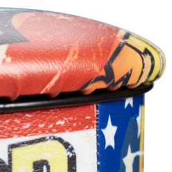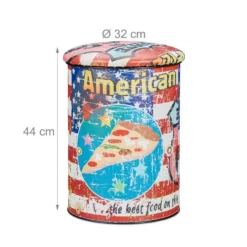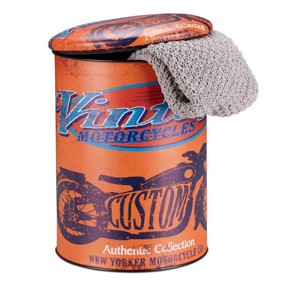 Vintage Sitztonne für Retro Flair daheim Die bequeme Sitztonne im Vintage Stil bringt mit ihren ansprechenden Motiven Retro-Flair in die eigenen vier Wände. Der runde Sitzhocker aus Metall ist mit PVC-Leder bezogen und mit Collagen aus diversen Motiven bedruckt. Wählen Sie zwischen romantischem Design und Shabby Chic Look. Der Polsterhocker ist gleichzeitig eine Aufbewahrungsbox für die Dinge des Alltags, wie Kuscheldecken, Spielsachen und vieles mehr. Ohne Deckel wird aus dem Wohnaccessoire ein dekorativer Papierkorb, der jederzeit in eine Sitzgelegenheit verwandelt werden kann.