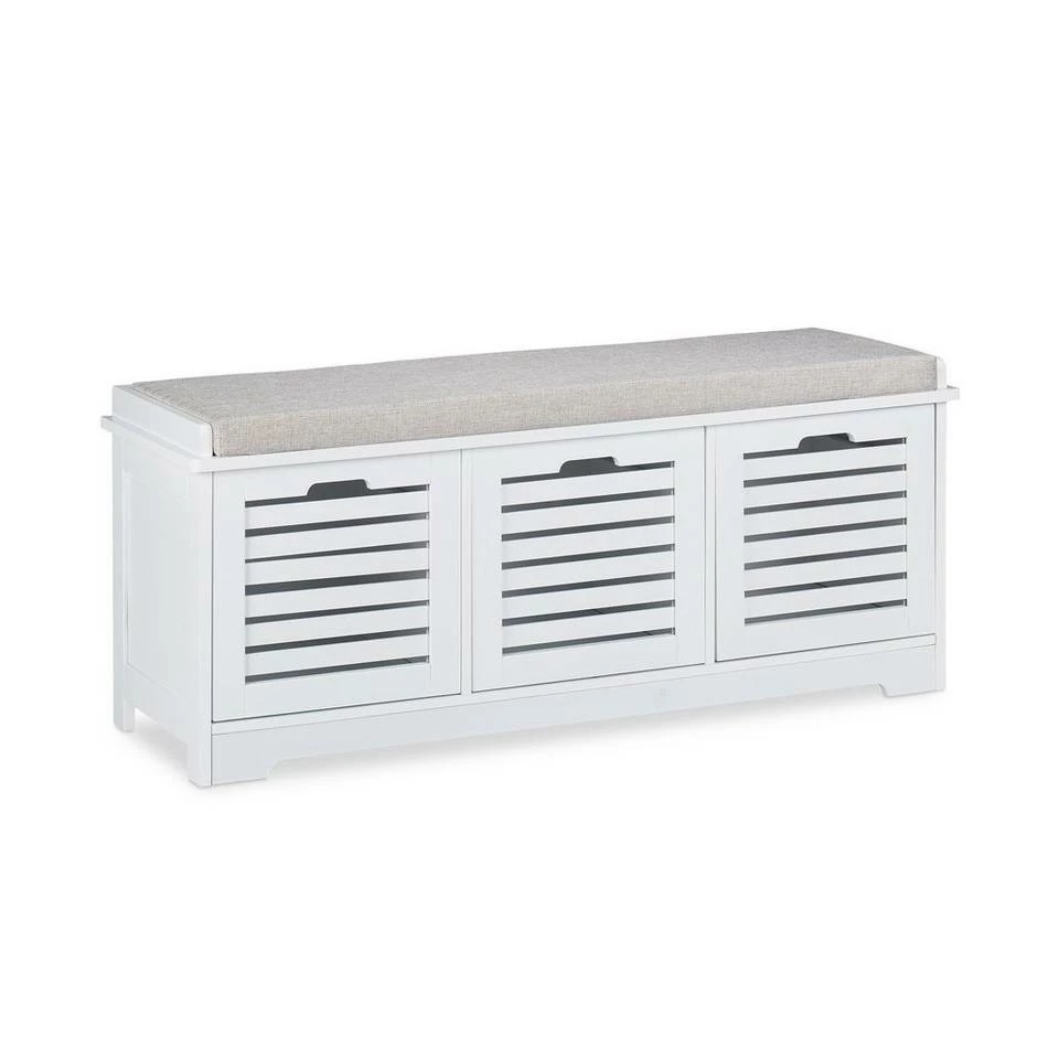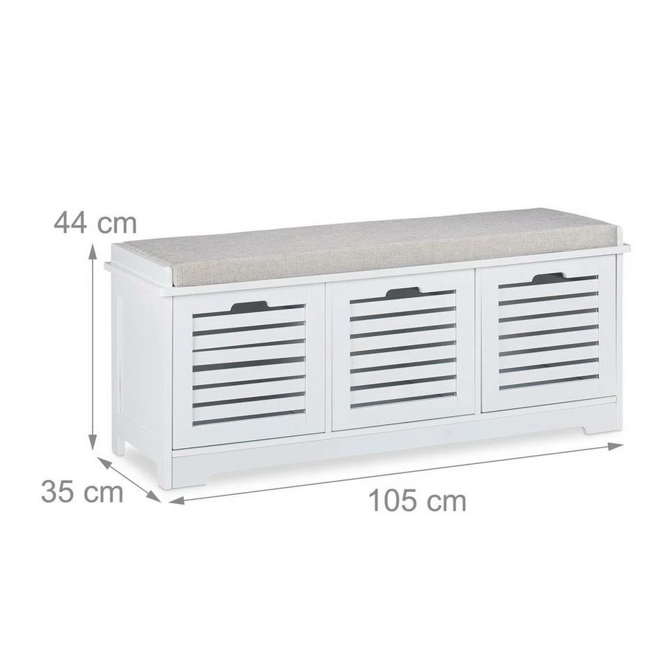 Schlichte Sitzkommode mit Körben Diese Sitzbank ist ideal, um gleichzeitig zwei Aufgaben zu erfüllen: Stauraum und Sitzgelegenheit. Die Garderobenbank verfügt über 3 Körbe, in denen Sie Schuhe, Schals und weitere Dinge aufbewahren können und somit im Flur Platz schaffen. Ebenso bietet die Truhenbank eine gepolsterte Sitzfläche, auf der Sie sich beim Schuhe anziehen setzen können. Die Sitztruhe ist auch ideal für Küche und Schlafzimmer – die zusätzliche Sitzfläche und der versteckte Stauraum sind auch dort praktisch und hilfreich.
