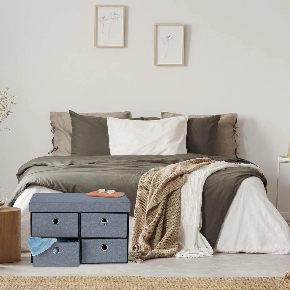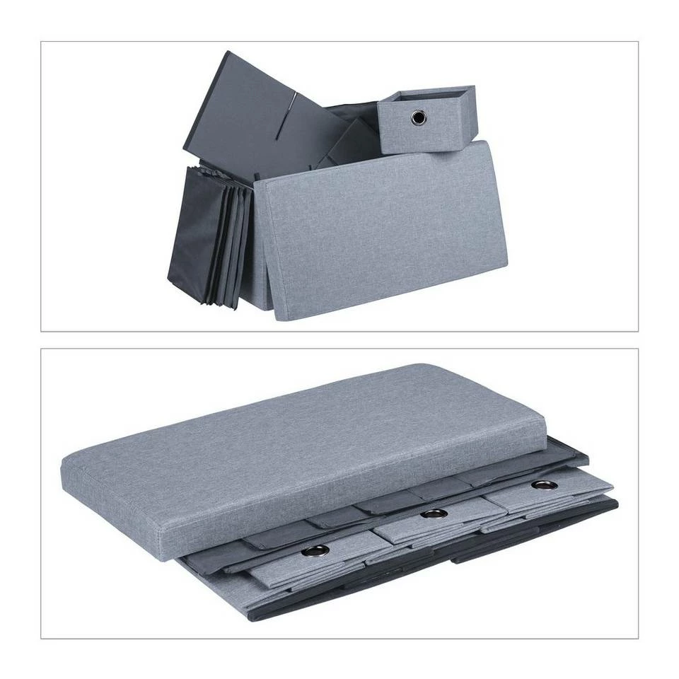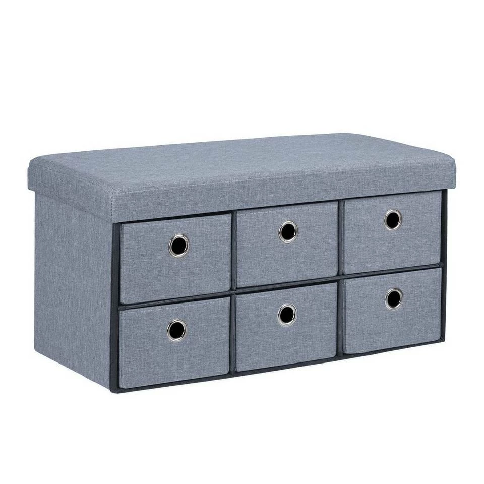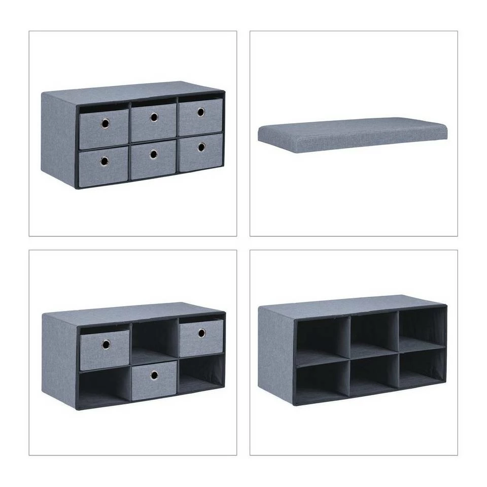 Schöne Sitzbank mit Stauraum Die moderne Sitzbank mit Stauraum ist der ideale Helfer in jedem Raum – egal, ob im Flur, Ankleidezimmer oder am Bettende. Das bequeme Polster bietet eine angenehme Sitzgelegenheit. In den sechs Schubfächern können Wäsche, Spielzeug, Zeitschriften oder Schuhe verstaut werden. Oder Du nutzt den großen Platz im Inneren der Sitzkommode ohne die Schubladen zur Aufbewahrung von größeren Dingen. Wenn die Aufbewahrungsbank einmal nicht gebraucht wird, nimmt sie gefaltet nur wenig Platz in Anspruch.