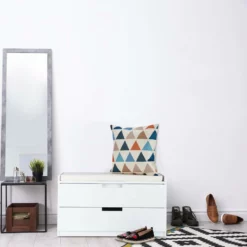 Moderne Garderobenbank mit Stauraum Diese schicke Sitzbank vereint einen bequemen Sitzplatz mit geräumigem Stauraum. Sowohl im im Eingangsbereich, der Küche als auch dem Schlafzimmer macht die Garderobenbank ein gute Figur. Verstauen Sie Utensilien wie Schals, Handschuhe, Handtücher und vieles mehr in den 2 Schubladen und sorgen Sie für Ordnung. Dank des aufliegenden Polsters können bis zu 2 Personen auf der Sitzkommode Platz nehmen, um beispielsweise ihre Schuhe bequem anziehen zu können.