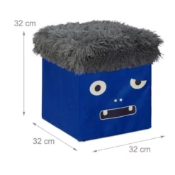 Blaue Aufbewahrungstruhe für Kinder Dieser Kinderhocker bietet mit seinem flauschigen, weich gepolsterten Deckel nicht nur eine gemütliche Sitzgelegenheit für Ihre Kleinen, sondern schafft auch praktischen Stauraum. Im Inneren der Spielzeugkiste finden Kuscheltiere, Puppen, Bauklötze und anderes Spielzeug Platz. Das coole Monster-Design sorgt außerdem für einen tollen Blickfang im Kinderzimmer und begeistert Mädchen und Jungs gleichermaßen. Wird der Hocker gerade nicht gebraucht, kann man ihn einfach zusammenfalten.