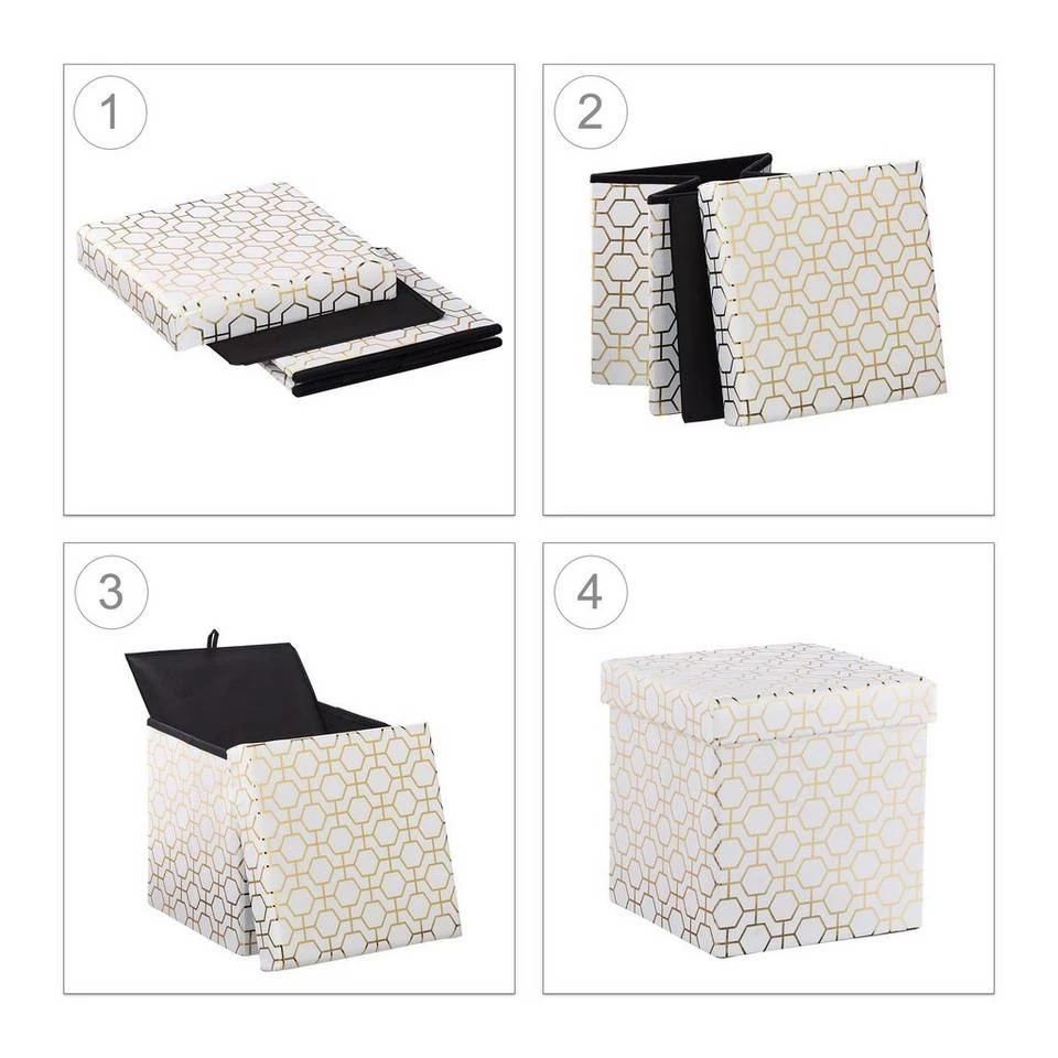 Faltbarer Sitzwürfel mit geometrischem Muster Ob als Sitzgelegenheit für spontanen Besuch oder als gemütlicher Fußhocker, der stilvoll gemusterte Sitzwürfel in Weiß und Gold bringt Eleganz ins Wohnzimmer. Das geometrische Muster im Art Deco Stil erinnert an das alte Hollywood und sorgt für Glamour in den heimischen vier Wänden. Der faltbare Polsterhocker mit Deckel verfügt über einen großen Stauraum und dient somit zugleich als Aufbewahrungsbox. Praktisch und schick passt der Sitzhocker insbesondere in helles Interior.