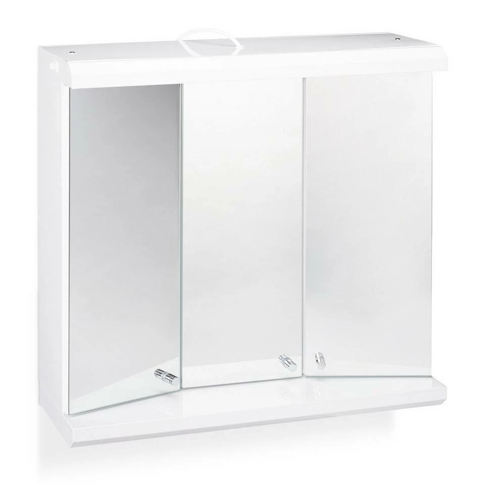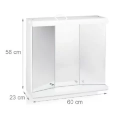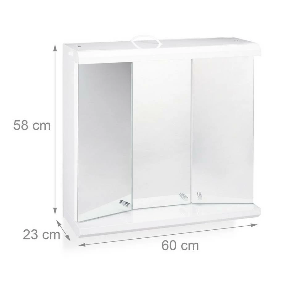 LED Spiegelschrank für Ihr Badezimmer Der Spiegelschrank mit den zwei angeschrägten Türen ist ein echter Hingucker für Ihr Badezimmer. Hinter den insgesamt drei Türen finden Zahnbürste, Creme und Kosmetikartikel Platz. Durch die LED Beleuchtung haben Sie sich immer gut im Blick. Der dekorative Schrank aus weißem Stahl fügt sich auch in Ihr Badezimmer. Im linken Fach befindet sich eine Steckdose für Föhn oder Rasierapparat. Schrank ist bereits vormontiert. Material für die Wandmontage ist im Lieferumfang enthalten. Hinweis: Schließen Sie das Stromkabel des Schranks an die klassischen Stromkontakte in Ihrem Bad an. Der Kabelanschluss befindet sich auf dem Schrank, die Steckdose in der oberen Ebene und der Lichtschalter ist an der linken Seite platziert.