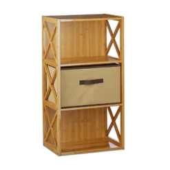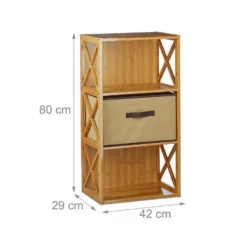Regal Bambus mit Faltbox Das Bambusregal wird zur hübschen Ablage in Ihrer Wohnung. Besonders in Räumen mit wenig Platz schafft es ordentlich sortierten Stauraum. Die faltbare Box ist dabei besonders für kleinteilige und lose Sachen geeignet. Nehmen Sie Wolle, Zeitschriften, Elektronik uvm. elegant aus dem Blickfeld. Der Einlegeboden sorgt hier für maximale Stabilität. Stellen Sie sich das Regal in den Flur, Eingangsbereich oder die Stube. Dank des widerstandsfähigen Bambus ist es ideal als Badregal geeignet.
