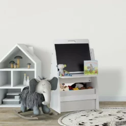 Schreibtafel und Spielzeugaufbewahrung für das Kinderzimmer Das weiße Spieleregal verbindet praktischen Stauraum mit einer kleinen Mal-Ecke aus Kindertafel & Ablage, an der sich Jungen & Mädchen kreativ austoben können. Dafür kann die Spieltafel in 3 verschiedenen Winkeln eingestellt werden. Sämtliches Zubehör, aber auch andere Spielsachen wie Kuscheltiere, Bauklötze & mehr finden in der Aufbewahrungsbox einen Platz. Die zwei Hängefächer aus Stoff eignen sich ideal zum Verstauen von Kinderbüchern, Leseheften oder Malbüchern.