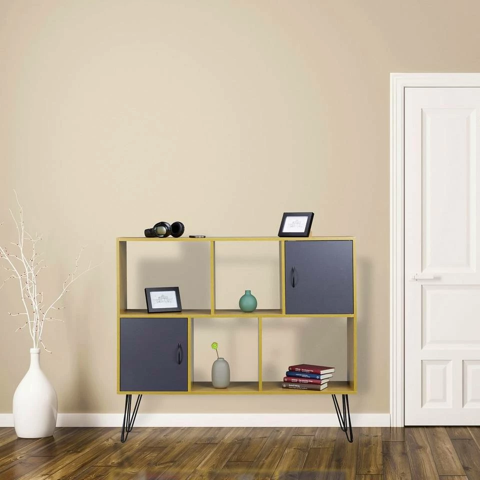 Wohnzimmerregal mit 6 Fächern Bringen Sie in den 6 großzügigen Fächern dieses Standregals Ihre CDs, DVDs, Bücher, Dekoartikel oder auch Akten und Ordner unter. Der Retro-Look des Regals versprüht ein nostalgisches Flair, dass an die 80er- und 90er Jahre zurückdenken lässt. Das schöne hellbraune Holzfurnier und die schwarzen Beine aus Metall stehen dabei in einem angenehmen Kontrast. Auch als Raumteiler macht das Dekoregal eine gute Figur: Unterteilen Sie Ihre Räume optisch in verschiedene thematische Bereiche, zum Beispiel in einen Arbeits- und einen Wohnbereich.
