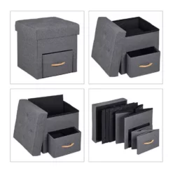 Grauer Sitzwürfel mit Schublade und Fach Dieser vielseitige Hocker ist nicht nur eine bequeme Sitzgelegenheit, er bietet dank Innenfach und Schublade auch Stauraum für Zeitschriften, Bücher, Fernbedienungen und allerlei Kleinkram. Der gepolsterte Deckel sorgt für einen hohen Sitzkomfort, ist aber auch als Ablage für die Füße nach einem langem Arbeitstag die richtige Wahl. Der Würfelhocker überzeugt optisch mit seinem Deckel mit Steppung und dem grauen Stoffbezug in Leinenoptik.