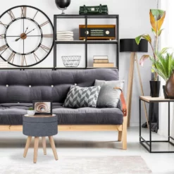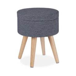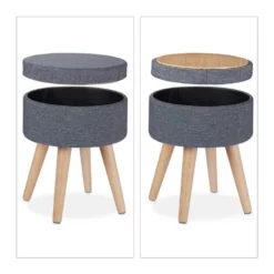 Runder Polsterhocker mit Tischfunktion Mit diesem Hocker holen Sie sich Sitzhocker und Beistelltisch in einem nach Hause, was ihn zur perfekten Ergänzung für Ihr Wohnzimmer macht. Die gepolsterte Seite des Deckels sorgt für einen hohen Sitzkomfort, während die andere Seite über eine Tischplatte aus Holz verfügt. Zusätzlich bietet der Stoffhocker in einem Innenfach Stauraum für Bücher, Zeitschriften und weitere Alltagsgegenstände. Optisch überzeugt der Couchhocker im skandinavischen Design mit seinem grauen Stoffbezug in Leinenoptik und Beinen aus natürlichem Buchenholz.
