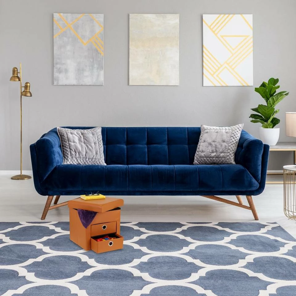 Moderner Aufbewahrungshocker mit Schubladen Die Sitzkiste mit Stauraum ist die clevere Lösung für Wohnzimmer, Schlafzimmer, Flur und andere Wohnbereiche. Dank der 2 Schubladen mit Grifföffnungen kannst Du im Inneren des Couchhockers Zeitschriften, Fernbedienungen, Ladekabel und andere Alltagsdinge blickdicht verstauen. Die gepolsterte Sitzfläche sorgt für ein angenehmes Sitzgefühl. Durch sein modernes Design ist der Sofahocker mit Deckel ein toller Hingucker. Bei Bedarf lässt sich der Würfelhocker falten und platzsparend wegräumen.