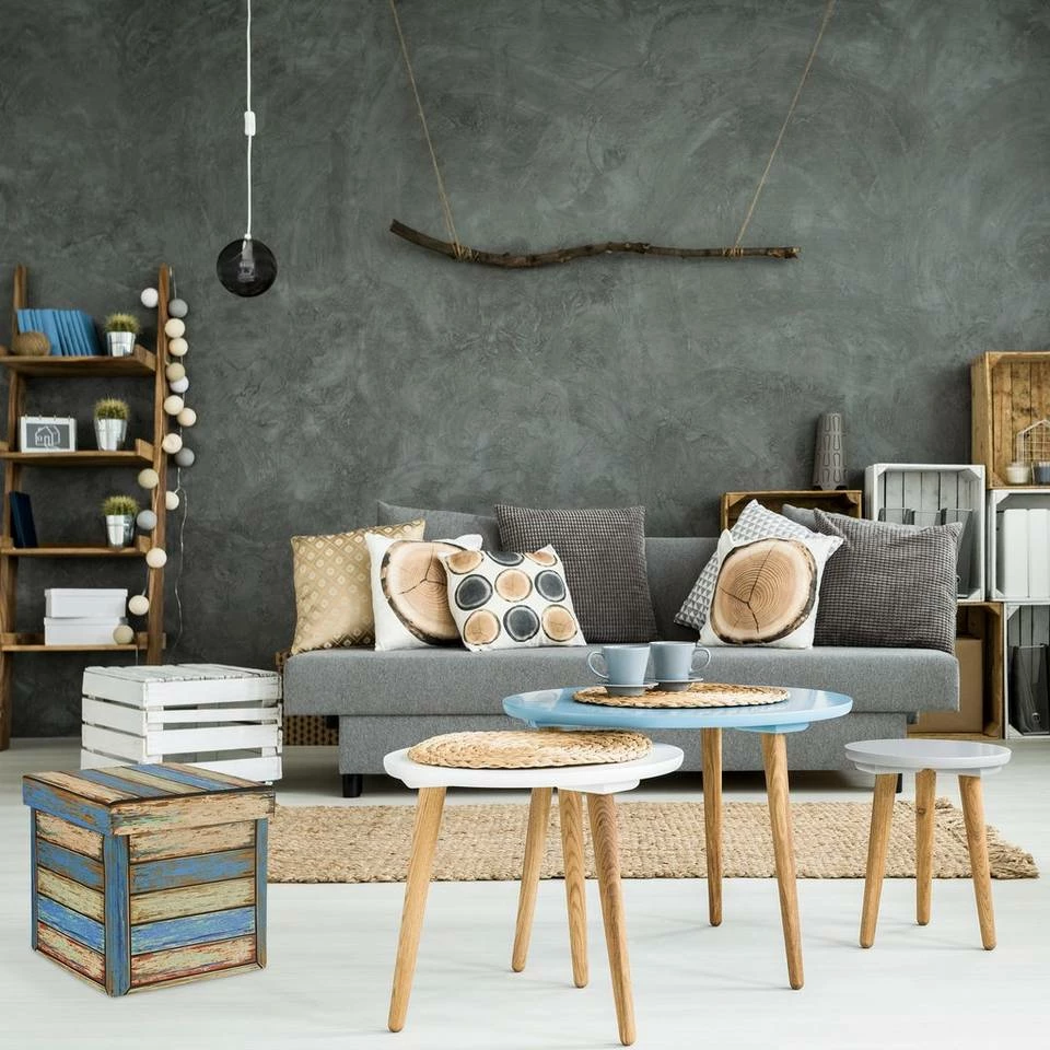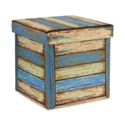 Dekorativer Aufbewahrungshocker zum Falten Die Sitzkiste mit Stauraum ist die clevere 2 in 1 Lösung für Wohnzimmer, Schlafzimmer, Flur und andere Wohnbereiche. Im Inneren des Stoffhockers verstaust Du Zeitschriften, die Kuscheldecke, Spielzeug und andere Alltagsgegenstände. Die gepolsterte Sitzfläche sorgt für ein angenehmes Sitzgefühl. Durch sein Vintage Design mit Holzplanken Motiv ist der Sofahocker außerdem ein toller Hingucker. Bei Bedarf lässt sich der Würfelhocker einfach zusammenfalten und platzsparend verstauen.