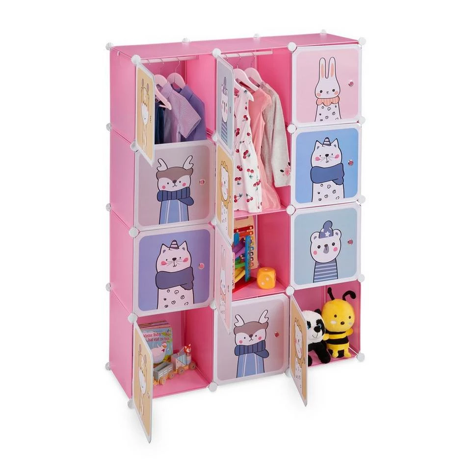 DIY Kinderzimmerregal mit 2 Kleiderstangen Das individuelle Steckregalsystem für das Kinderzimmer ist die ideale Aufbewahrungsmöglichkeit für Kleidung, Spielzeug und mehr. Das Regalsystem aus Kunststoff-Platten und Steckverbindungen ermöglicht einen Aufbau in die Höhe oder in die Breite – ganz nach Wunsch. Dank der 2 Kleiderstangen lassen sich Jacken und Oberteile ordentlich aufhängen. Das Highlight des Steckschranks sind die Türen mit lustigen Tier-Motiven im Comic-Design, die bei allen Kindern garantiert für Begeisterung sorgen werden.
