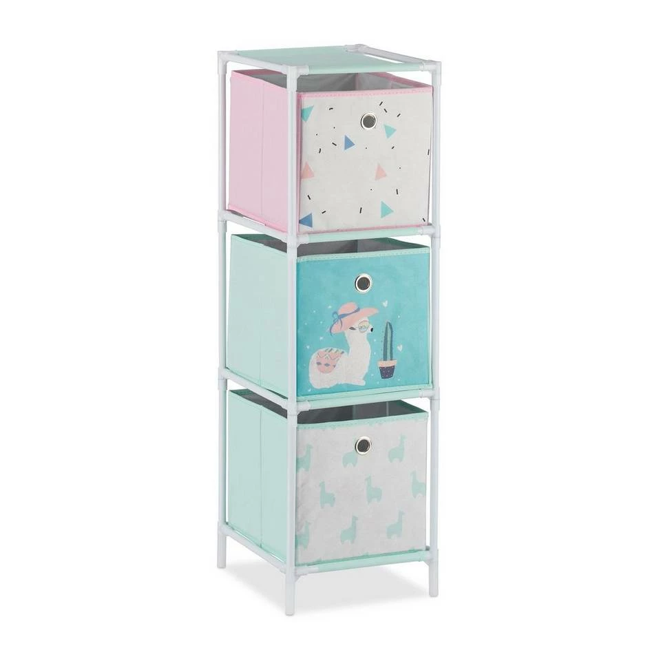 Kindgerechte Aufbewahrung von Spielzeug Mit dem leichten Standregal macht den Kindern nicht nur das Spielen Spaß, sondern auch das Aufräumen. In die bunten Aufbewahrungsboxen des stabilen Kinderzimmerregals sind blitzschnell alle Spielsachen, Kuscheltiere und Bücher verstaut. Das Regal für das Kinderzimmer besitzt zudem die ideale Höhe, damit auch die Kleinen mühelos an die Sachen herankommen. Die Boxen haben ein Griffloch und sind mit einem bezaubernden Motiv versehen: Lustige, bunte Lamas erfreuen nicht nur Kinderherzen.