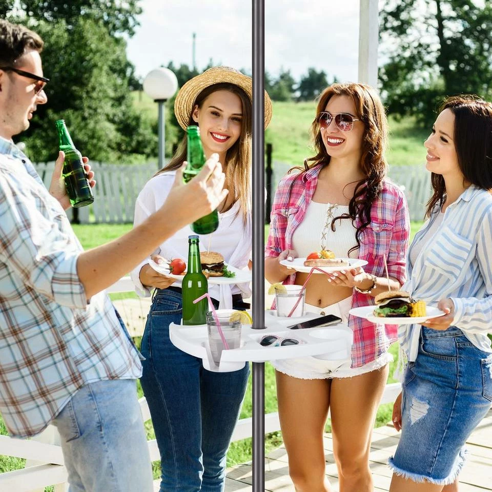 Flexibler Tisch für Ihren Sonnenschirm Um entspannt eine gute Zeit im Garten zu verbringen, ist dieser Stehtisch für Ihren Sonnenschirm ideal. Anstatt einen schweren Gartentisch durch die Gegend zu wuchten, benötigt der Schirmtisch nur wenige Handgriffe, um einsatzbereit zu sein. Insgesamt stehen Ihnen und Ihren Lieben 8 Ablagen zur Verfügung, darunter 4 Flaschenhalter. Ein Plus des höhenverstellbaren Tabletts ist, dass Sie es Ihren Bedürfnissen entsprechend nutzen können, ob Sie nun im Liegen nach Snacks greifen oder sich im Stehen ein gutes Glas mit Freunden gönnen möchten.