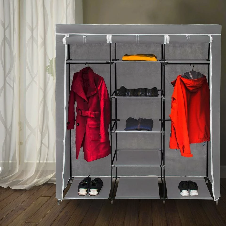 Stabiler Stoffkleiderschrank mit Kleiderstangen Egal, ob Sie Saisontextilien staubfrei lagern oder Ihre Campingausrüstung sicher verwahren wollen – der mobile Stoffschrank in XXL erfüllt alle Wünsche. Mit 9 Ablagen & 2 Kleiderstangen bietet der Faltschrank viel Stauraum für Kleidung, Schuhe & mehr. Der leichte Kleiderschrank aus Stoff ist schnell auf- & abgebaut & eignet sich wunderbar als Reiseschrank beim Camping. Nutzen Sie die Faltgarderobe als Kellerschrank, bleiben Ihre Sachen dank der Reißverschlüsse staubfrei & doch immer zugänglich.