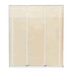 - Stauraum: 3 x beiger Faltschrank mit Kleiderstangen und je 9 Ablagen – Für Kleidung, Decken uvm.