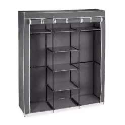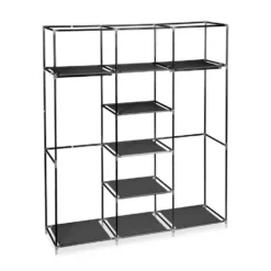 Stabiler Stoffkleiderschrank mit Kleiderstangen Egal, ob Sie Saisontextilien staubfrei lagern oder Ihre Campingausrüstung sicher verwahren wollen – der mobile Stoffschrank in XXL erfüllt alle Wünsche. Mit 9 Ablagen & 2 Kleiderstangen bietet der Faltschrank viel Stauraum für Kleidung, Schuhe & mehr. Der leichte Kleiderschrank aus Stoff ist schnell auf- & abgebaut & eignet sich wunderbar als Reiseschrank beim Camping. Nutzen Sie die Faltgarderobe als Kellerschrank, bleiben Ihre Sachen dank der Reißverschlüsse staubfrei & doch immer zugänglich.