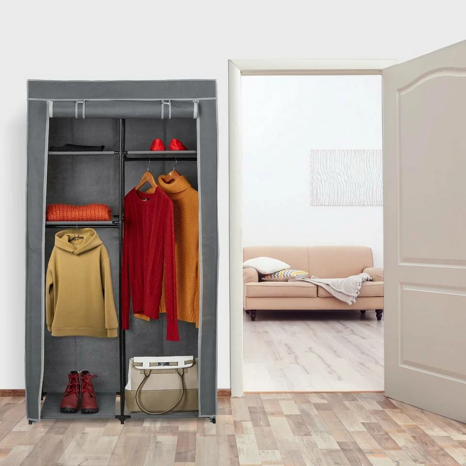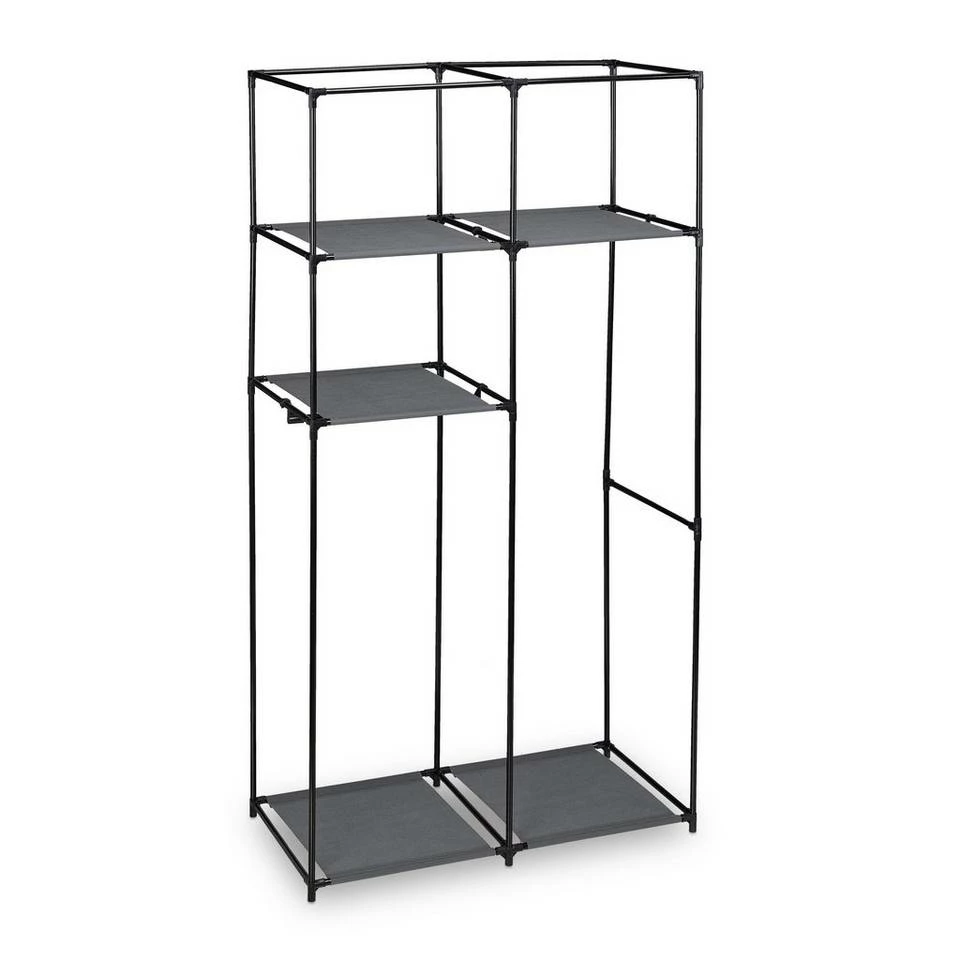 Stoffkleiderschrank für Schlafzimmer, Keller und andere Räume Ob als flexibler Kleiderschrank im Schlafzimmer, als Kellerkleiderschrank zum Lagern von Saisontextilien oder sogar beim Camping – dieser Faltschrank kann auf verschiedenste Weise zum Einsatz kommen. Mit 5 Ablagen & 2 Kleiderstangen bietet er geräumigen Stauraum für Kleidungsstücke aller Art. Dabei überzeugt der Schrank vor allem mit seinem geringen Gewicht und der dennoch hohen Stabilität. Das Stecksystem ermöglicht einen schnellen Aufbau des Gestells, der Bezug schützt Ihre Kleidung vor Staub.