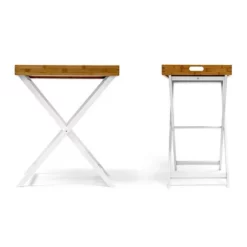 Weißer Klapptisch mit Serviertablett Genießen Sie Ihr Frühstück ganz bequem im Sessel oder auf dem Balkon. Stellen Sie den Tabletttisch dazu einfach neben sich und legen Sie Kaffee, Tee, Brötchen und die Zeitung darauf ab. Das Tablett ist abnehmbar und kann auch separat als Servier- oder Küchentablett verwendet werden. In diesem Fall ist das Untergestell mit einem Handgriff zusammengeklappt und blitzschnell platzsparend verstaut. Das weiße Holz und der naturbelassene Bambus des Tabletts wirken freundlich und hell in Ihrem Heim. Sie fügen sich dezent und stilvoll in Ihre Einrichtung.