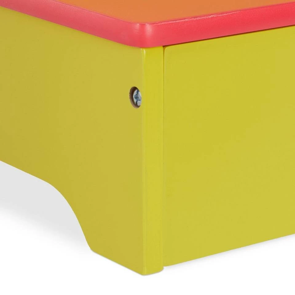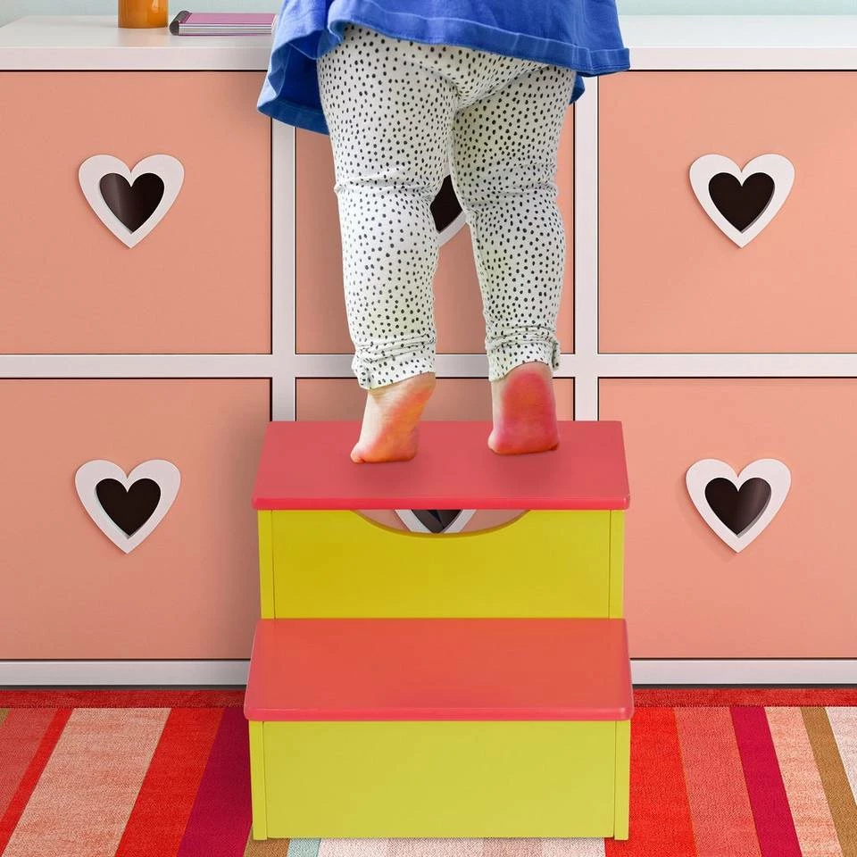 Bunter Kinderschemel als Aufstiegshilfe Dieser niedrige Tritthocker mit 2 Stufen ist die ideale Aufstiegshilfe für Kinder. Der leichte Stufenhocker kann einfach vor einem Regal im Kinderzimmer platziert und jederzeit problemlos umgestellt werden. Somit gelangen Deine Kleinen ohne fremde Hilfe an ihre Spielsachen oder Bücher. Auch im Badezimmer hilft der Kindertritt, das Waschbecken und die Toilette leichter zu erreichen. Die Trittstufe fördert so die Selbstständigkeit Deines Kindes und überzeugt zudem als dekoratives Kindermöbel.