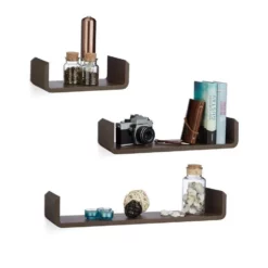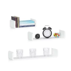 Freischwebende Wandregale in verschiedenen Farben Die Wandregale in verschiedenen Größen ergänzen sich bestens und bilden zusammen ein 3-teiliges Set. Ob in der Küche, im Flur, Kinder- oder Wohnzimmer: Mit den U-förmigen Wandablagen verleihen Sie Ihren Wänden neuen Charme. Für eine besonders harmonische Optik sorgen die abgerundeten Ecken der Wandboards. Jedes Hängeregal verfügt über 2 Aufhängungen auf der Rückseite, die eine kinderleichte Montage ermöglichen. Die dazu benötigten Schrauben und Dübel sind bereits im Lieferumfang enthalten.