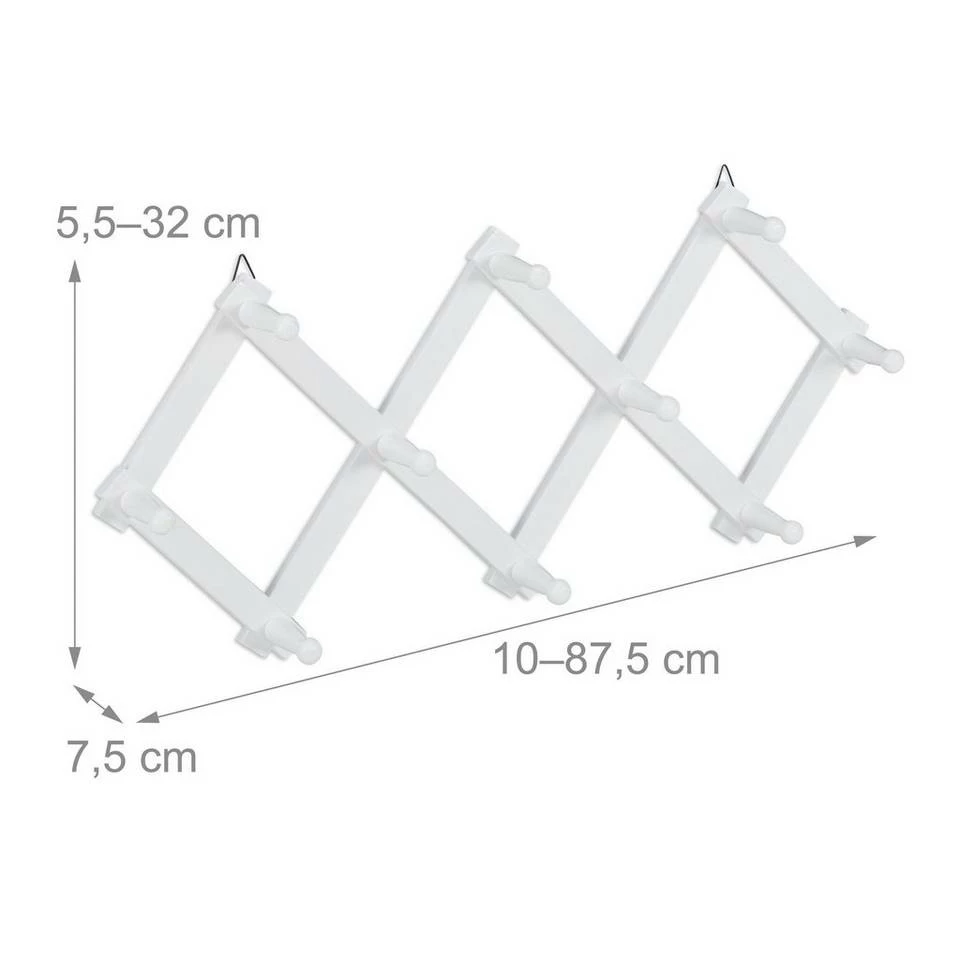 Moderne Kleiderleiste für den Eingangsbereich Diese flexible Wandhakenleiste lässt Sie im Nu für Ordnung und Übersicht in Flur, Küche oder Badezimmer sorgen. Je nach Platz kann die Scherengarderobe weiter auseinander gezogen oder mehr zusammen gefaltet werden. Entscheiden Sie selbst, was am Besten für Sie passt. Die moderne Wandgarderobe aus Holz wird platzsparend an der Wand montiert, wo sie mit 10 Kleiderhaken ausreichend Stauraum für Handtücher, Jacken, Taschen, Halstücher und vieles mehr schafft.