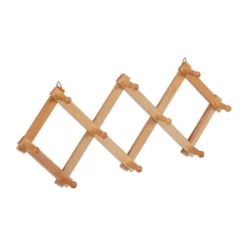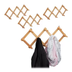 Moderne Kleiderleiste für den Eingangsbereich Diese flexible Wandhakenleiste lässt Sie im Nu für Ordnung und Übersicht in Flur, Küche oder Badezimmer sorgen. Je nach Platz kann die Scherengarderobe weiter auseinander gezogen oder mehr zusammen gefaltet werden. Entscheiden Sie selbst, was am Besten für Sie passt. Die moderne Wandgarderobe aus Holz wird platzsparend an der Wand montiert, wo sie mit 10 Kleiderhaken ausreichend Stauraum für Handtücher, Jacken, Taschen, Halstücher und vieles mehr schafft.