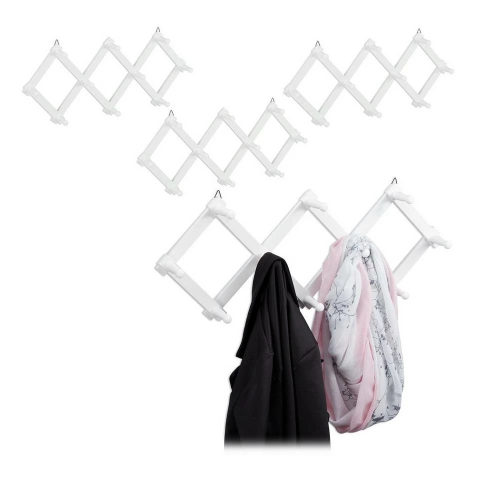 Moderne Kleiderleiste für den Eingangsbereich Diese flexible Wandhakenleiste lässt Sie im Nu für Ordnung und Übersicht in Flur, Küche oder Badezimmer sorgen. Je nach Platz kann die Scherengarderobe weiter auseinander gezogen oder mehr zusammen gefaltet werden. Entscheiden Sie selbst, was am Besten für Sie passt. Die moderne Wandgarderobe aus Holz wird platzsparend an der Wand montiert, wo sie mit 10 Kleiderhaken ausreichend Stauraum für Handtücher, Jacken, Taschen, Halstücher und vieles mehr schafft.