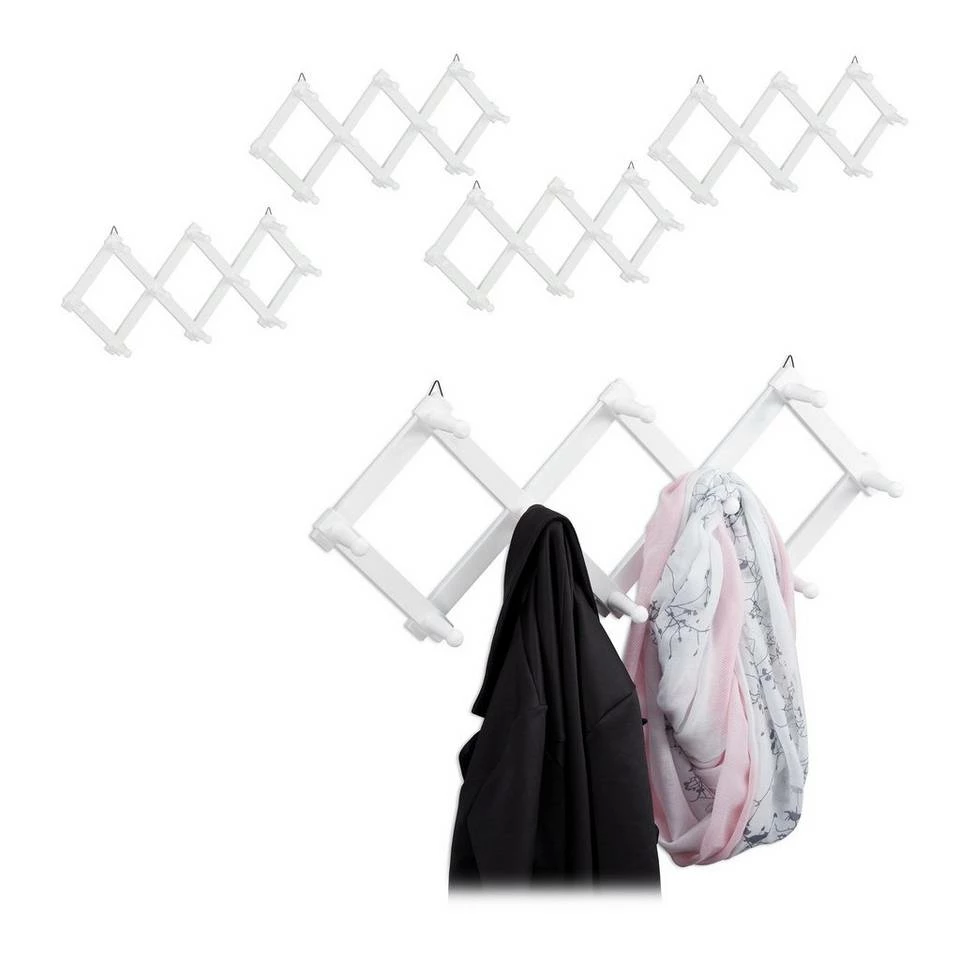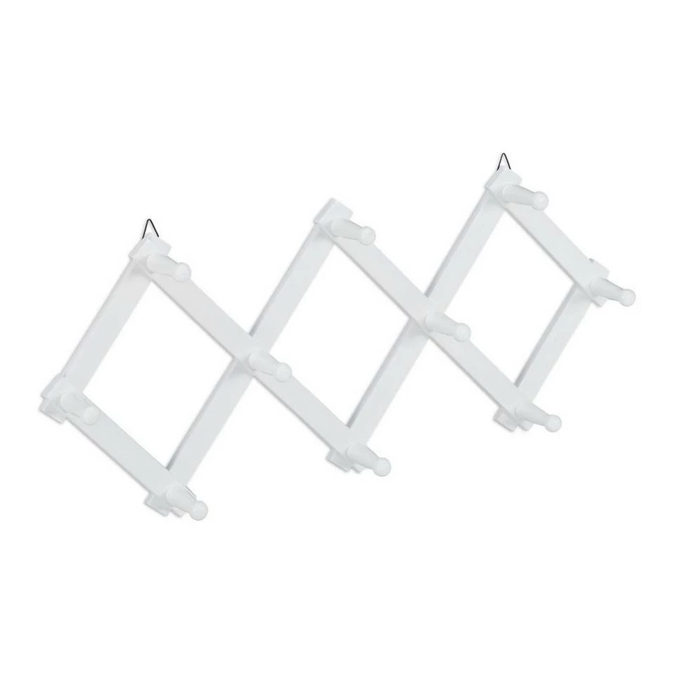 Moderne Kleiderleiste für den Eingangsbereich Diese flexible Wandhakenleiste lässt Sie im Nu für Ordnung und Übersicht in Flur, Küche oder Badezimmer sorgen. Je nach Platz kann die Scherengarderobe weiter auseinander gezogen oder mehr zusammen gefaltet werden. Entscheiden Sie selbst, was am Besten für Sie passt. Die moderne Wandgarderobe aus Holz wird platzsparend an der Wand montiert, wo sie mit 10 Kleiderhaken ausreichend Stauraum für Handtücher, Jacken, Taschen, Halstücher und vieles mehr schafft.