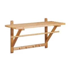 Wandgarderobe mit Kleiderstange Mit 4 Haken und einer kleinen Kleiderstange eignet sich diese Wandgarderobe perfekt für jeden Flur. Die große Ablagefläche bietet dabei Raum für Hüte, Schals und Co. Doch auch als Badregal mit Handtuchhalter ist das Wandregal aus feuchtigkeitsresistentem Bambus perfekt geeignet. Dabei bietet das Bambusregal viel Stauraum für Handtücher und Kosmetik, während auf der Handtuchstange Ihre Textilien schneller trocknen können. Die Hakenleiste eignet sich dabei optimal zum Aufhängen von Handtüchern, Waschlappen und vielem mehr.