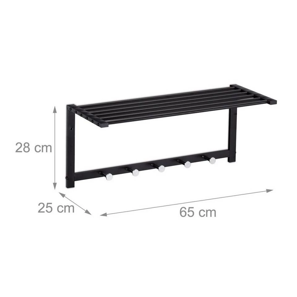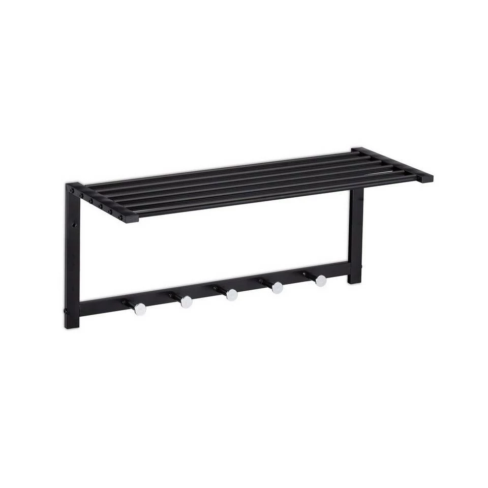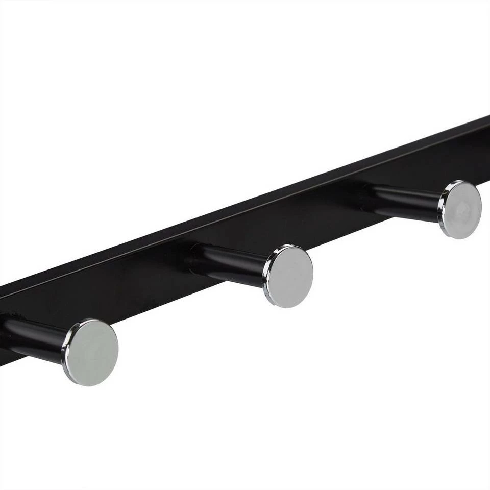 Schwarze Garderobenleiste im modernen Design Wenn Sie eine kleine Wohnung haben, ist diese Hängegarderobe die richtige Wahl für Sie. Die Kleiderleiste verfügt über 5 Haken, an denen Sie im Flur Jacken und Schals und im Bad Hand- und Duschtücher aufhängen können. Auf der oberen Ablage finden Hüte, Taschen oder Badutensilien Platz. So schafft die Flurgarderobe wertvollen Stauraum, ohne Stellplatz wegzunehmen. Dabei überzeugt die schwarze Kleiderhakenleiste mit silbernen Akzenten mit ihrer modernen Optik.