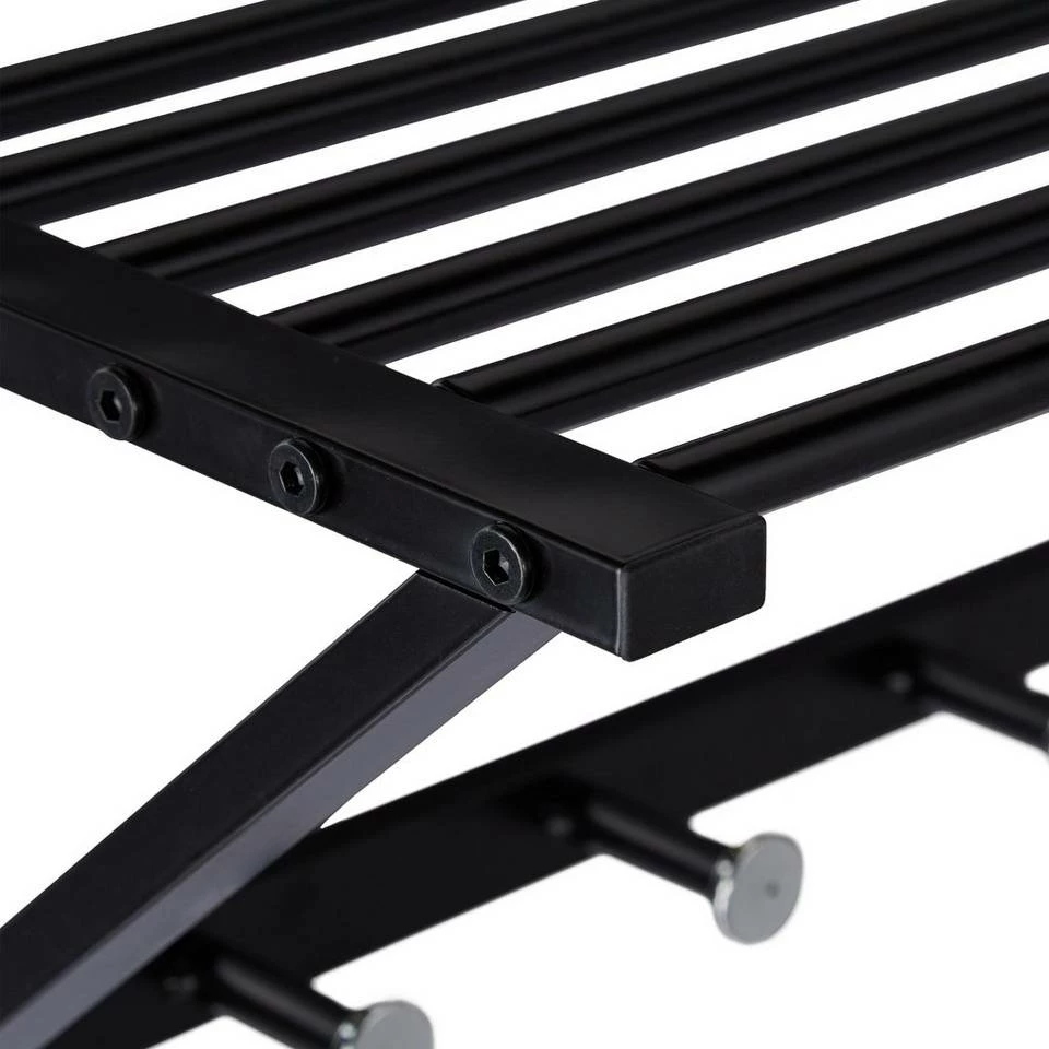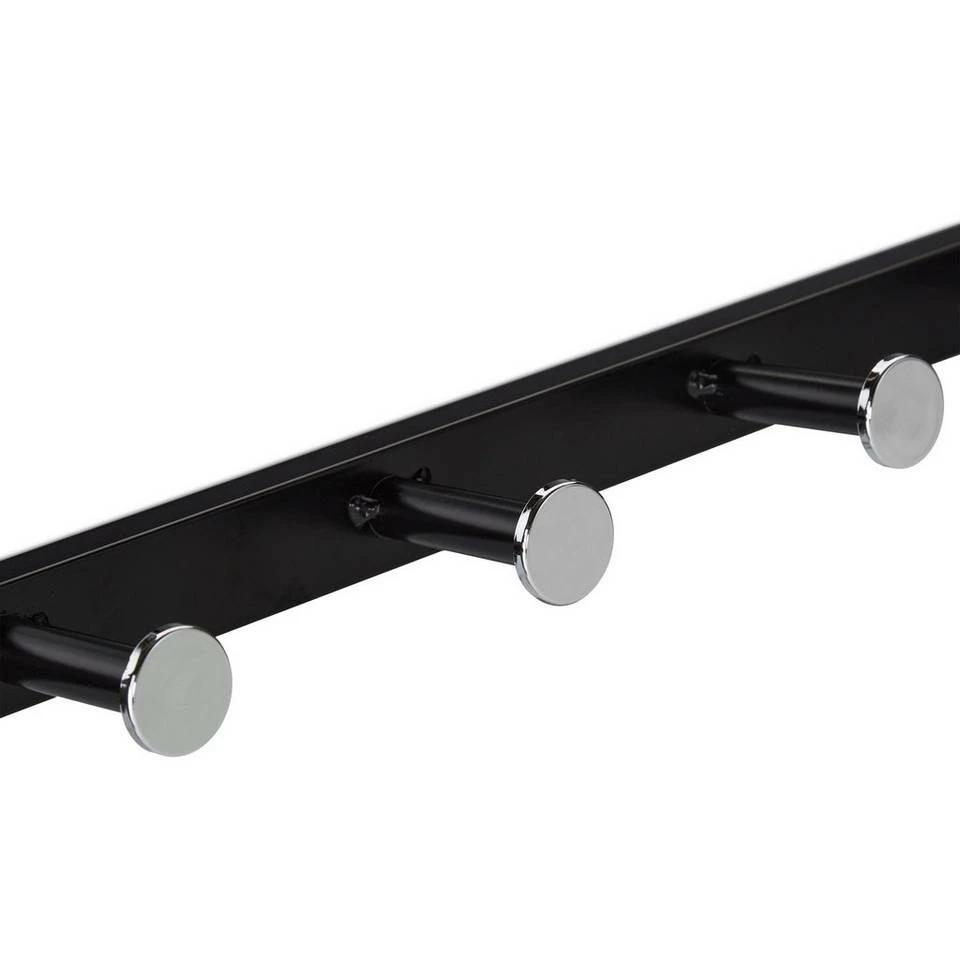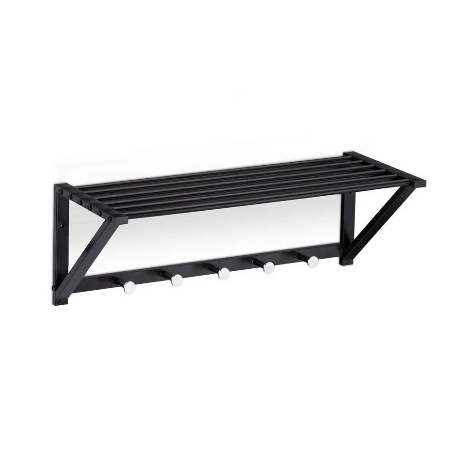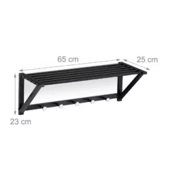 Moderne Garderobe mit Hutablage Wenn Sie nur wenig Platz im Flur zur Verfügung haben, ist diese Wandgarderobe die Lösung. Hängen Sie Jacken, Schals oder Schirme an den 5 Haken der Kleiderleiste auf und verstauen Sie Taschen, Hüte und Mützen auf der oberen Ablage. Auf diese Weise nutzen Sie den vorhandenen Platz optimal aus. Auch im Badezimmer überzeugt die Hakenleiste als praktische Badetuchablage. Das schwarze Schweberegal setzt dank den silbernen Details stilvolle Akzente und harmoniert wunderbar mit modernem Mobiliar.
