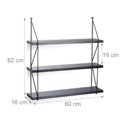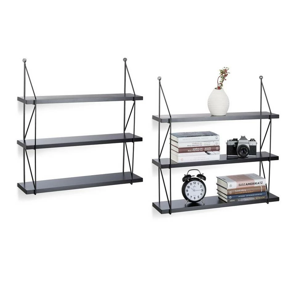 - 2er Set Wandregale: 2 große Hängeregale zur Wandmontage in Schwarz – Mit 3 Ebenen und seitlichem Rahmen – Maße H x B x T: ca. 62 x 60 x 16 cm