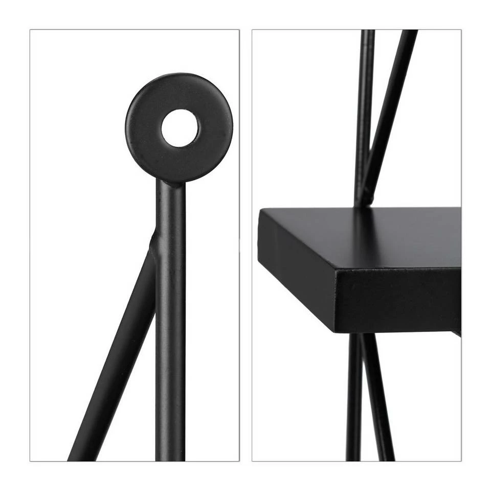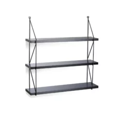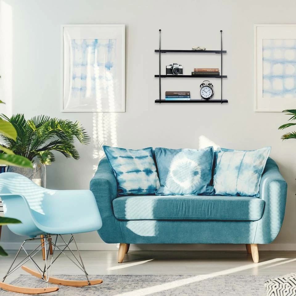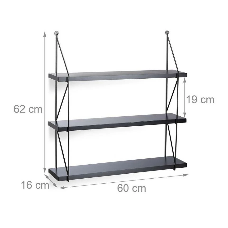Großes Hängeregal für die Wand Das geräumige Hängeregal mit drei Ebenen schafft zusätzlichen Stauraum an Ihrer Wand. Die robusten Regalbretter aus matt lackiertem MDF werden von einem filigranen Metallgestell an den Seiten getragen. Das offene und einfache Design wirkt luftig und fügt sich nahtlos in jeden Einrichtungsstil. Das unifarbene Wandregal ist schwarz lackiert. Die Wandbretter bieten überall im Haus eine praktische Ablagefläche, sei es für Geschirr in der Küche oder für Bücher im Kinderzimmer.