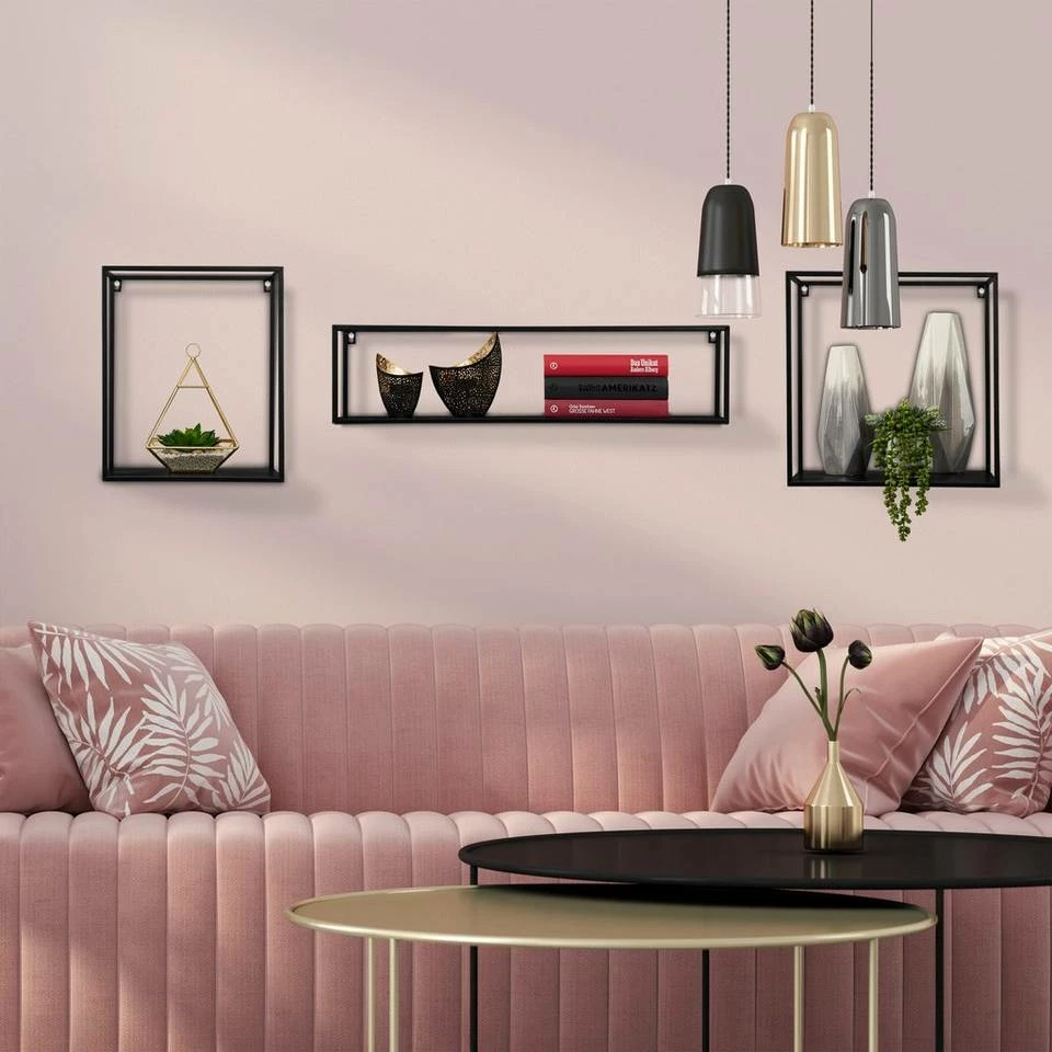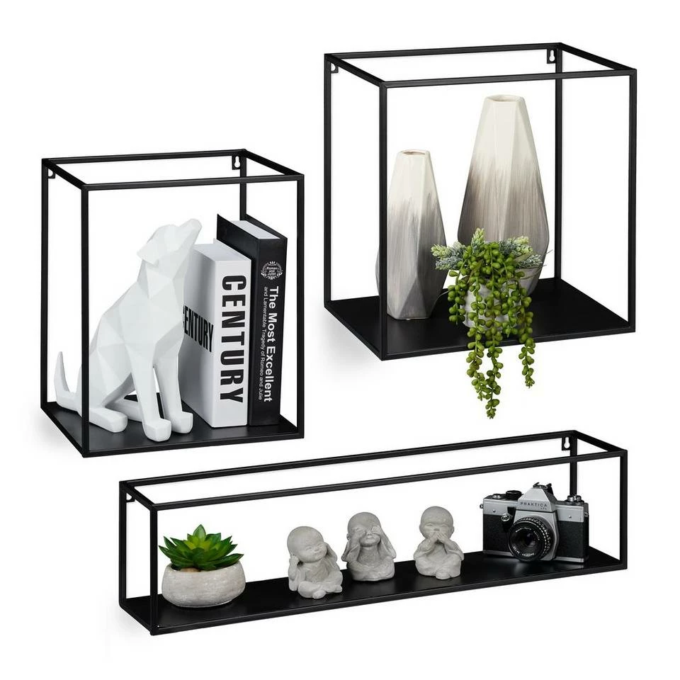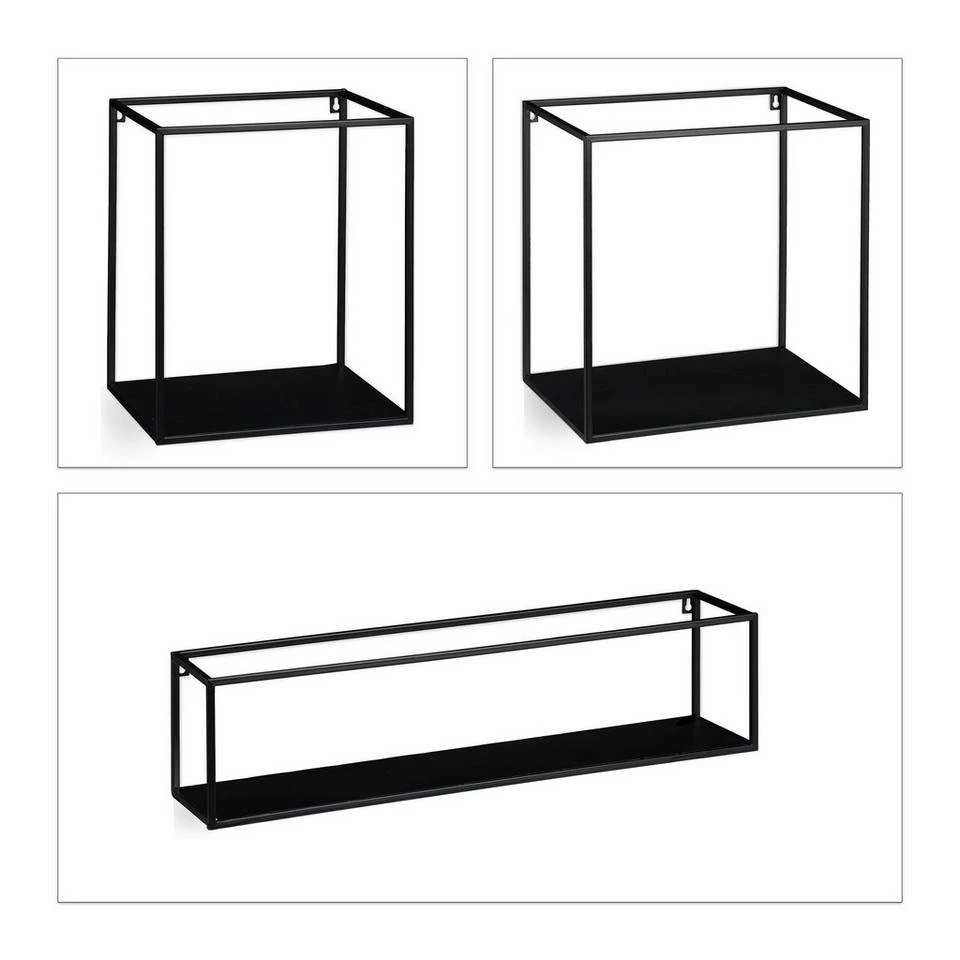 Schwarze Hängeregale Um leeren Wänden neues Leben einzuhauchen, sind die Metallregale im 3er Set eine gute Wahl. Dabei ist es Ihnen überlassen, ob Sie die Hängeregale zusammenspielen lassen oder lieber einzeln platzieren. Was immer Sie mit den Cube Regalen in Szene setzen möchten, dank des dezenten Schwarz kommen Ihre Accessoires erstklassig zur Geltung. Das gilt für Vasen, Fotos, Figürchen und vieles mehr. Dübel und Schrauben für die Wandmontage liegen bereits bei.