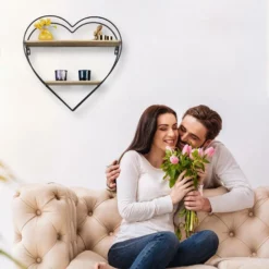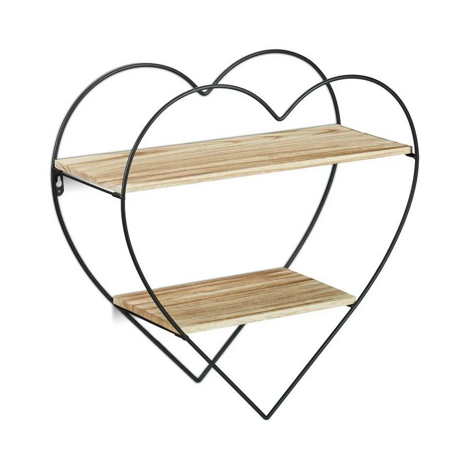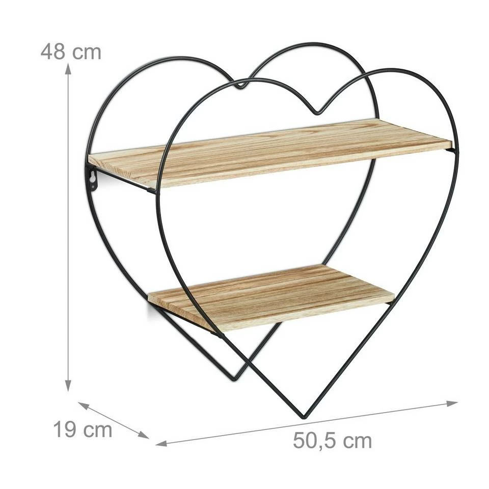 Romantisches Dekowandregal in Herzform Das schöne Eisenregal kombiniert industrielles Flair mit einem Hauch Romantik. Der schwarze Herzrahmen aus Metall und die Ablagen aus Holz kreieren zusammen einen aufregenden Vintage-Retro-Look. Das Herzregal eignet sich als Ablage für kleine Pflanzen, Fotos, Kerzen und andere Dekoelemente. Lassen Sie Ihrer Fantasie freien Lauf. An die Wand gehängt, scheint das vielseitige Metallregal zu schweben. Das dekorative Hängeregal wird ein garantierter Blickfang in Ihrer Wohnung.