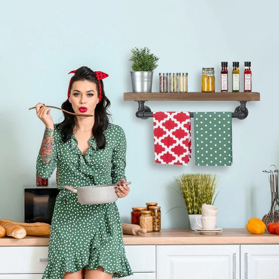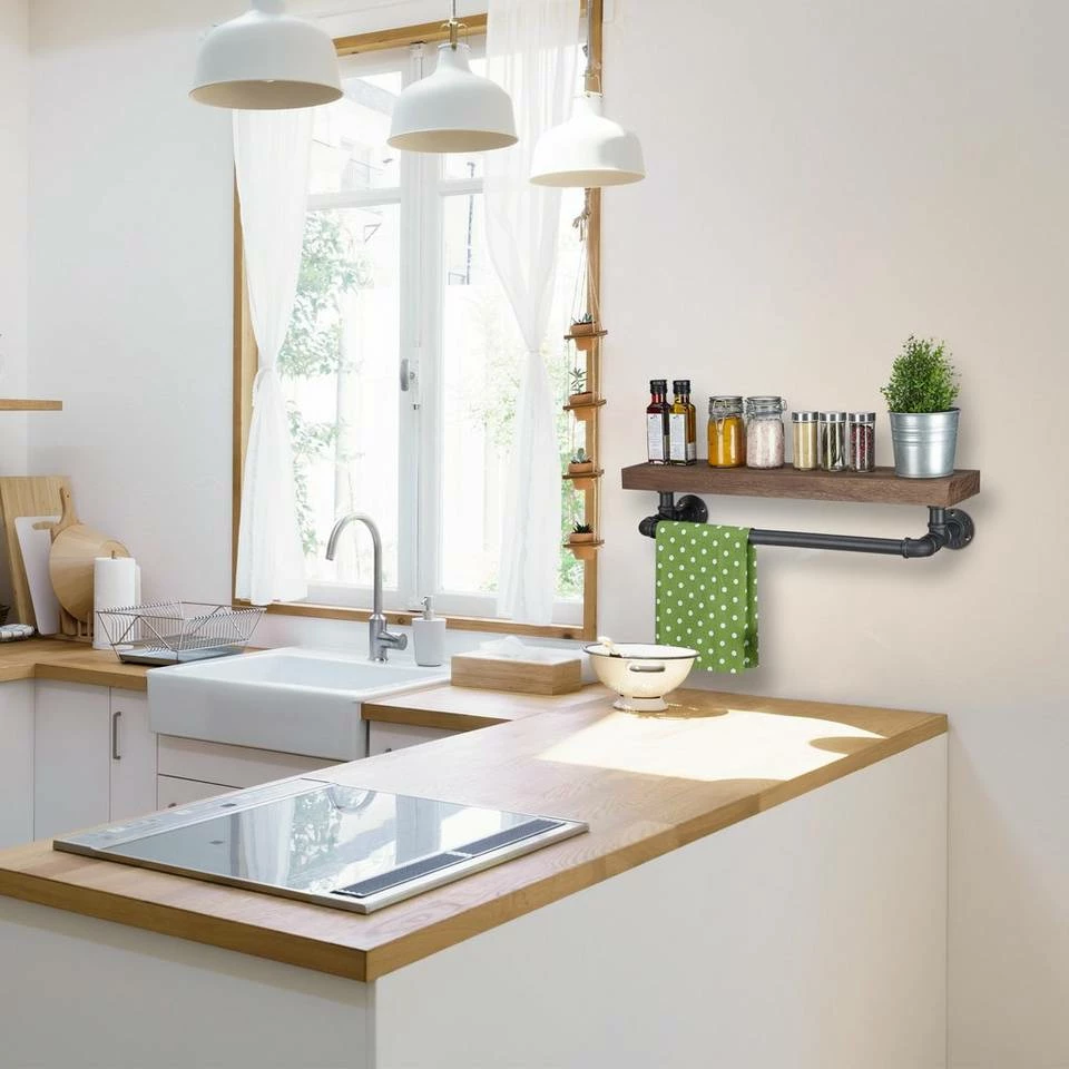 Küchenregal mit Handtuchstange Mit dem praktischen Hängeregal nutzen Sie den Platz an der Wand in Ihrer Küche optimal aus. Platzieren Sie Vorratsgläser, Teedosen, Gewürzbehälter oder Ähnliches auf der offenen Ablage. So haben Sie Ihre Vorräte ordentlich aufbewahrt und immer gleich zur Hand. Ihre Trocken- und Küchenhandtücher hängen Sie auf die robuste Stange auf. Das Regal punktet neben seiner Stabilität mit seiner stylischen Optik. Das braune Holzbrett wird ergänzt durch schwarze Metallrohere und wird so zum Blickfang im angesagten Industrial-Design.
