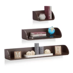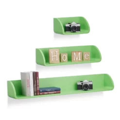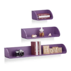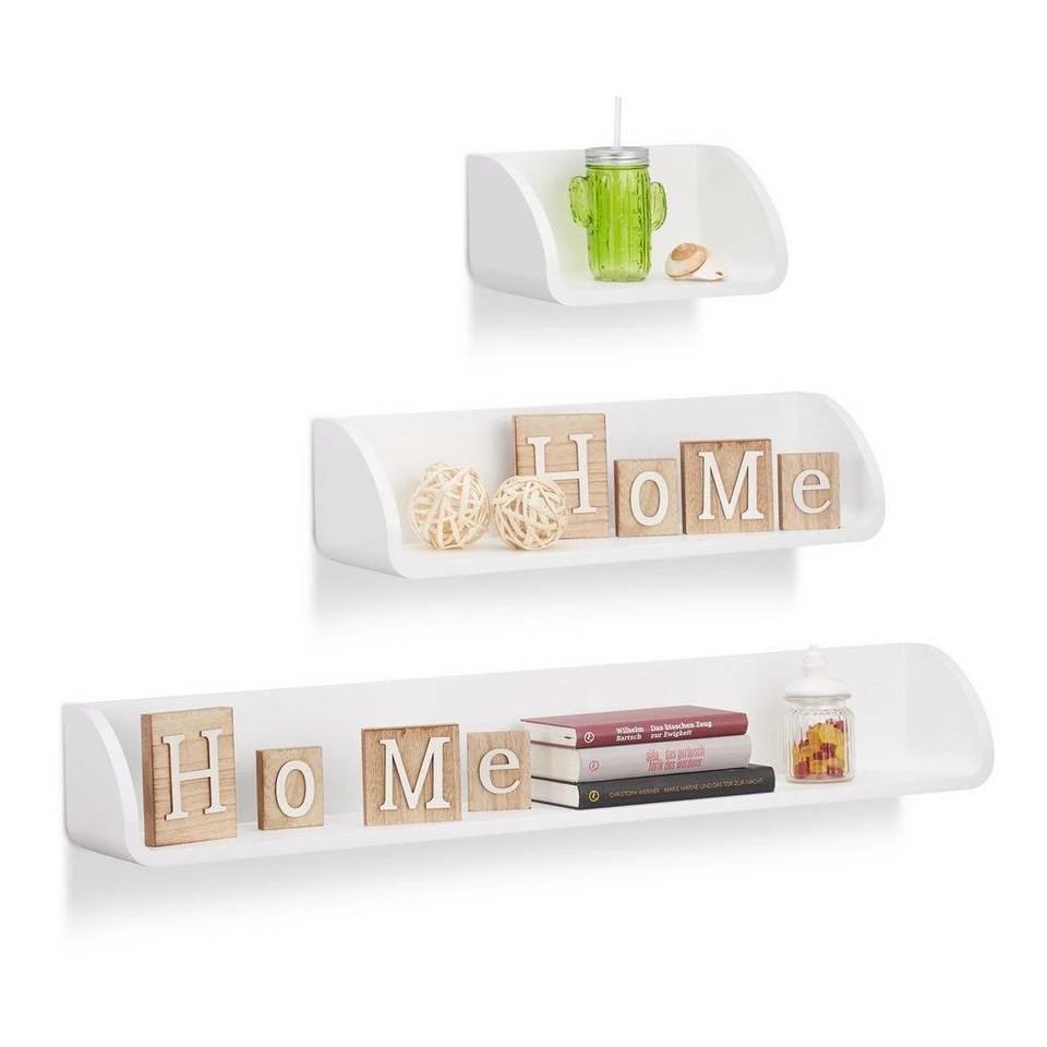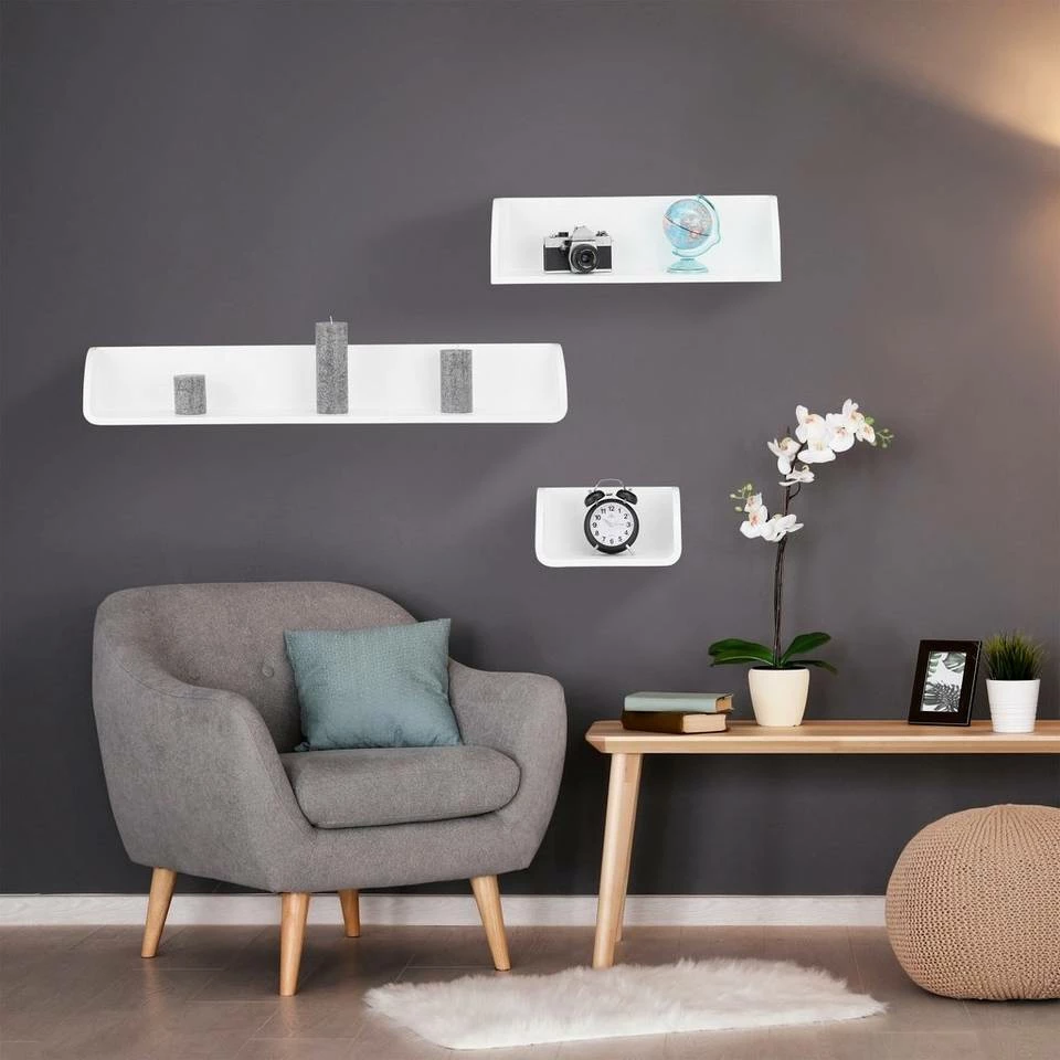 Freischwebendes Wandregal Das Regalsystem im 3er Set sorgt für einen schönen Blickfang in Ihrem Zuhause! Die unterschiedlich großen Schweberegale sind vielseitig einsetzbar und eignen sich zum Verstauen von Büchern und DVDs oder zum Präsentieren Ihrer neuesten Deko-Artikel. Die Hängeregale bestehen aus robustem und lackiertem MDF und lassen sich durch integrierte Ösen an der Rückseite einfach an die Wand montieren.