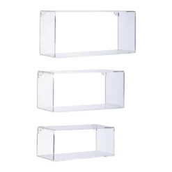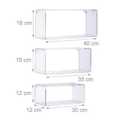 Eckige Schweberegale für die Wandmontage Wenn Sie wollen, dass Ihre Vasen, DVDs oder Dekoartikel bestens zur Geltung kommen, sind diese transparenten Wandregale eine gute Wahl. Die Wandboards aus Acryl sind bruchsicher und äußerst pflegeleicht. An die erforderlichen Dübel und Schrauben für die Wandmontage ist genauso gedacht wie an die rückseitigen Bohrlöcher. Die durchsichtigen Hängeregale schaffen im Handumdrehen neuen Stauraum. Wenn Sie sie von der Wand nehmen, beispielsweise im Falle eines Umzuges, lassen sich sich einfach ineinander stapeln und platzsparend verstauen.