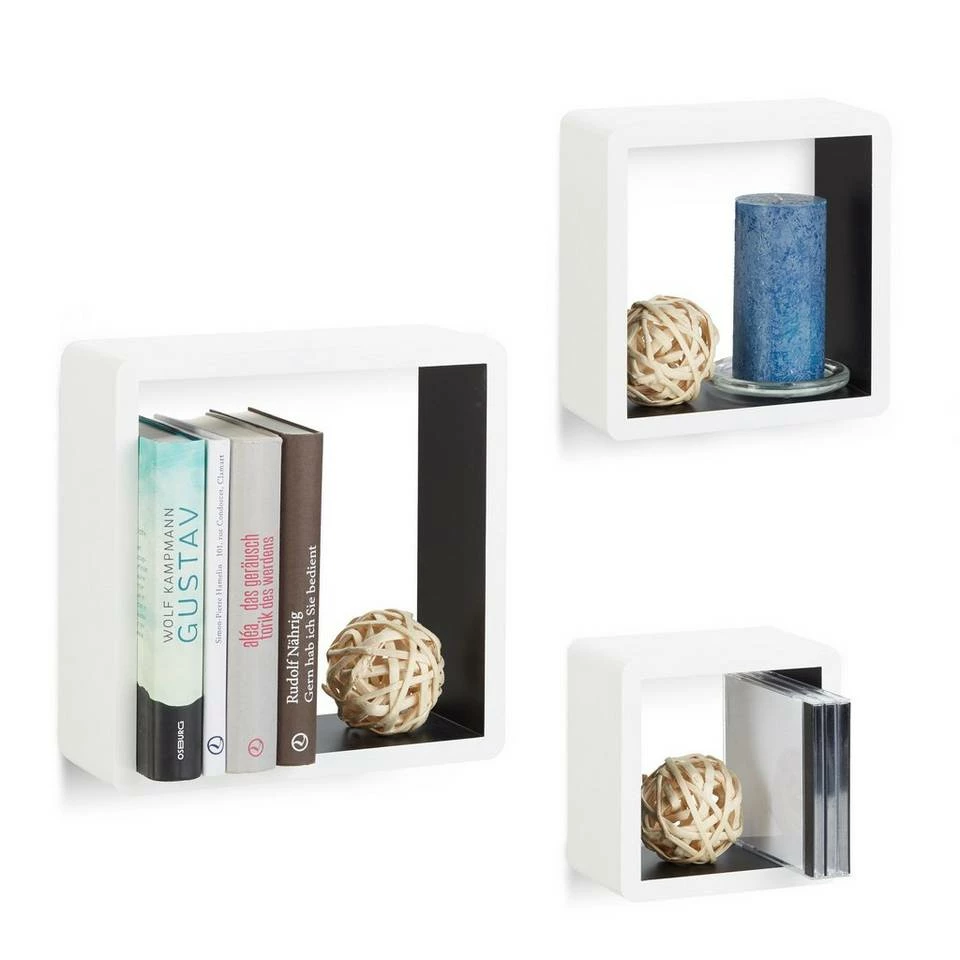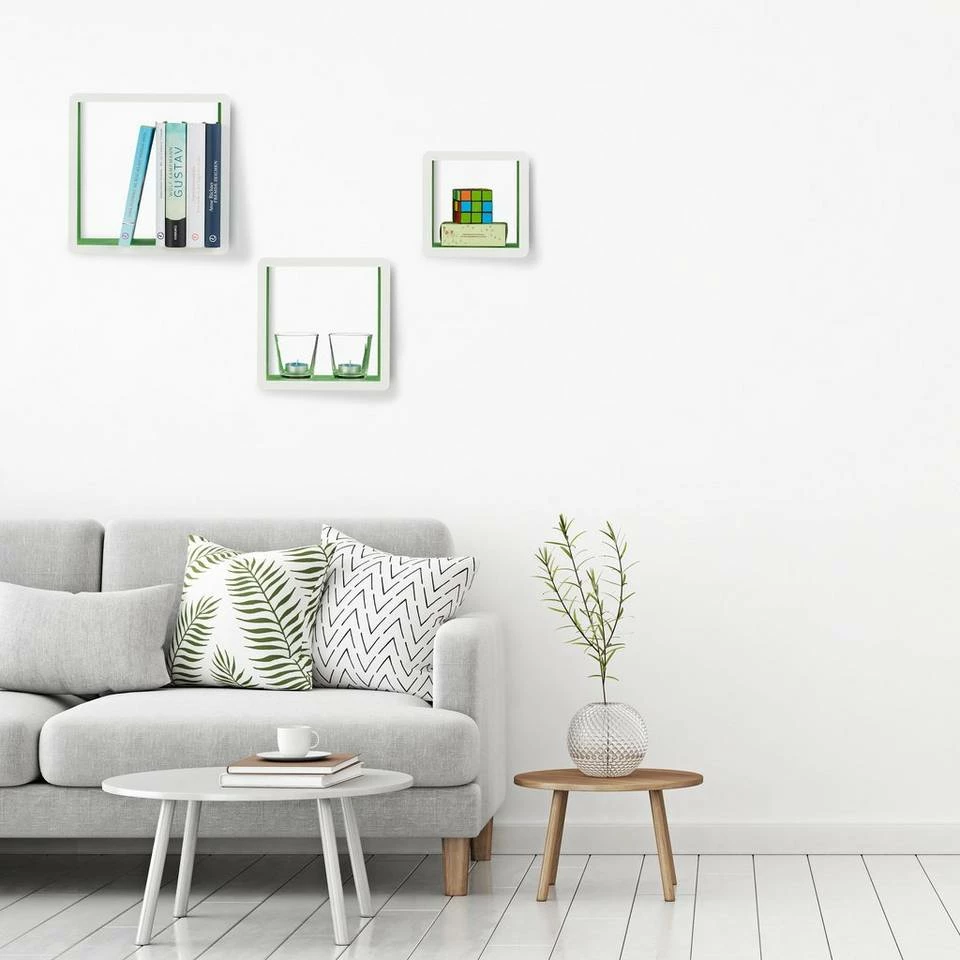 Wandregal Cube ziert jedes Zimmer Das offene Design des Wandregale 3er Sets gibt Ihnen viel Spielraum zur kreativen Entfaltung. Schmücken Sie die drei Wandcubes mit Ihren liebsten Fotos, Souvenirs vom Urlaub oder schicken Accessoires. Die Wandablagen sind in vielen verschiedenen Farben erhältlich. Wählen Sie zwischen einfarbigen oder zweifarbigem Design und setzen Sie tolle Akzente auf Ihrer Zimmerwand. Die belastbaren Wandboards passen in jedes Zimmer und wirken sowohl einzeln als auch im Set als toller Eyecatcher.