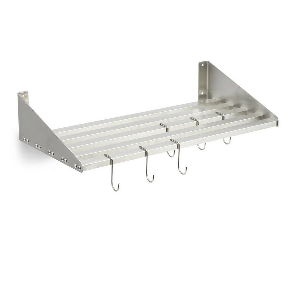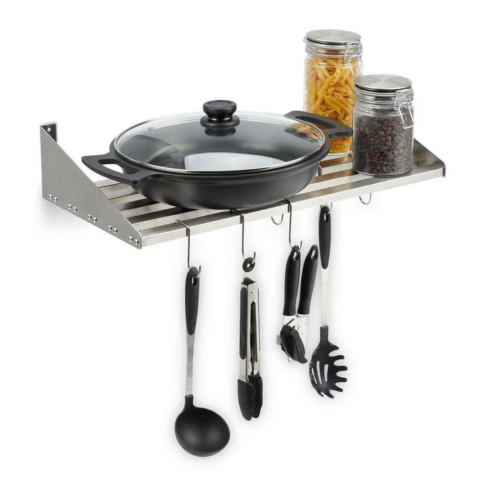 Küchenregal mit 6 Haken Egal ob Töpfe, Geschirr, Vorräte oder Gewürze – auf diesem praktischen Edelstahl Wandregal finden die verschiedensten Küchenutensilien einen Platz. Zusätzlich können an den 6 Haken Kochbesteck, Geschirrtücher und andere Dinge zum Hinhängen platziert werden. Da das Regal komplett aus Edelstahl gefertigt ist, lässt es sich gut reinigen und ist dadurch besonders hygienisch. Das robuste Regalboard ist für Lasten bis 30 Kilogramm geeignet und damit ideal für die Nutzung in der Gastronomie oder Küche.