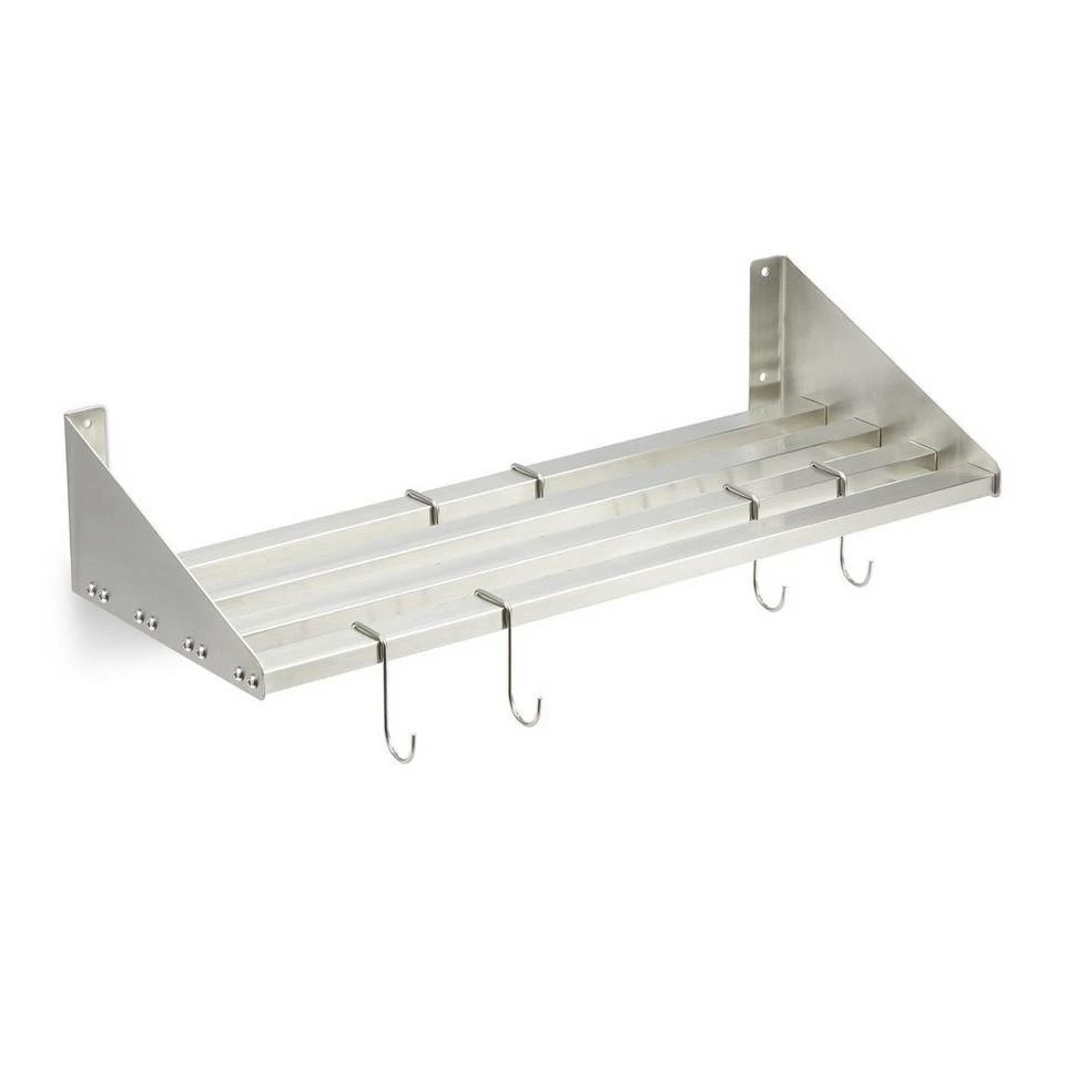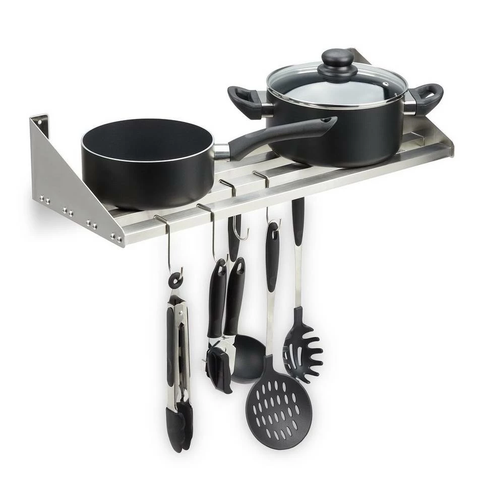 Metall Wandregal für die Küche Egal ob in der Großküche oder in der heimischen Kochstube – das praktische Schweberegal ist der ideale Begleiter, wenn Sie Töpfe, Geschirr, Vorratsdosen, Gewürze und anderes Küchenzubehör verstauen wollen. Zusätzlich bieten 6 Haken Platz für Kochbesteck und Geschirrtücher. Komplett aus hygienischem Edelstahl gefertigt, lässt sich das Gewürzregal einfach reinigen. Den festen und sicheren Halt an der Wand garantieren 4 Schrauben und Dübel. Dadurch kann das Regal bis 30 Kilogramm tragen.