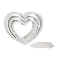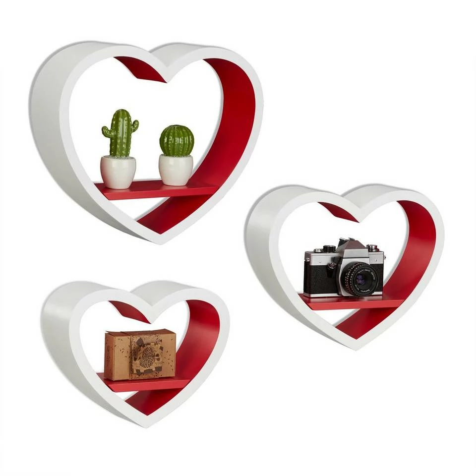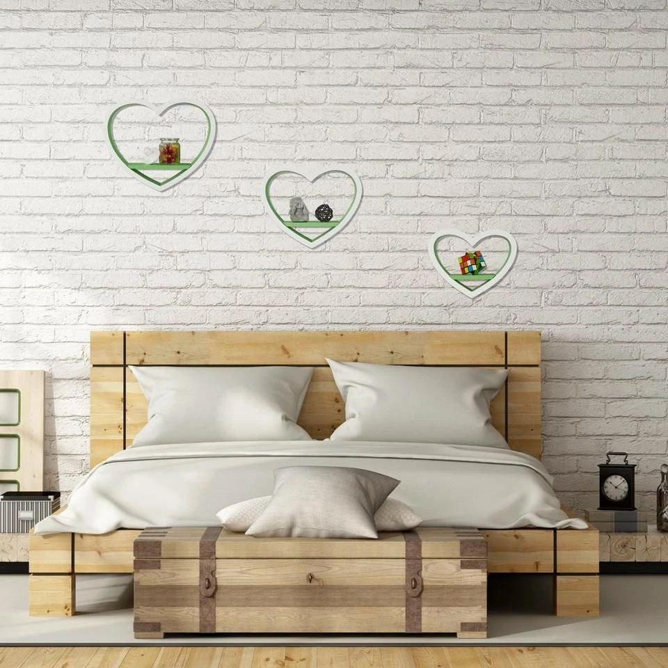 Wandregal Herzen für Ihr Zuhause Das romantische Wandregal Herz im praktischen 3er Set schmückt jede Wand. Urlaubsfotos, Souvenirs und Dekoaccessoires kommen auf dem herzförmigen Schweberegal erst richtig zur Geltung. Das Set aus drei Wandablagen in verschiedenen Größen besteht aus robustem MDF mit einer matten Lackierung. Sie haben die Auswahl zwischen vielen verschiedenen Farben, ob Rot wie die Liebe oder Grün wie die Hoffnung. Das Dekoregal ist ein schönes Geschenk insbesondere für junge Frauen. Aber nicht nur im Mädchenzimmer sind die Herzen ein Hingucker. Schmücken Sie mit den dekorativen Wandboards Wohnzimmer, Schlafzimmer oder den Flur.