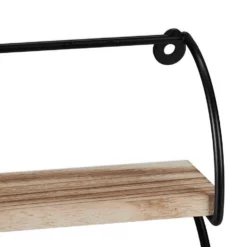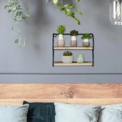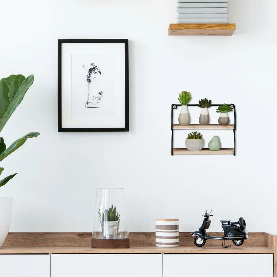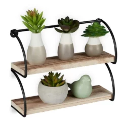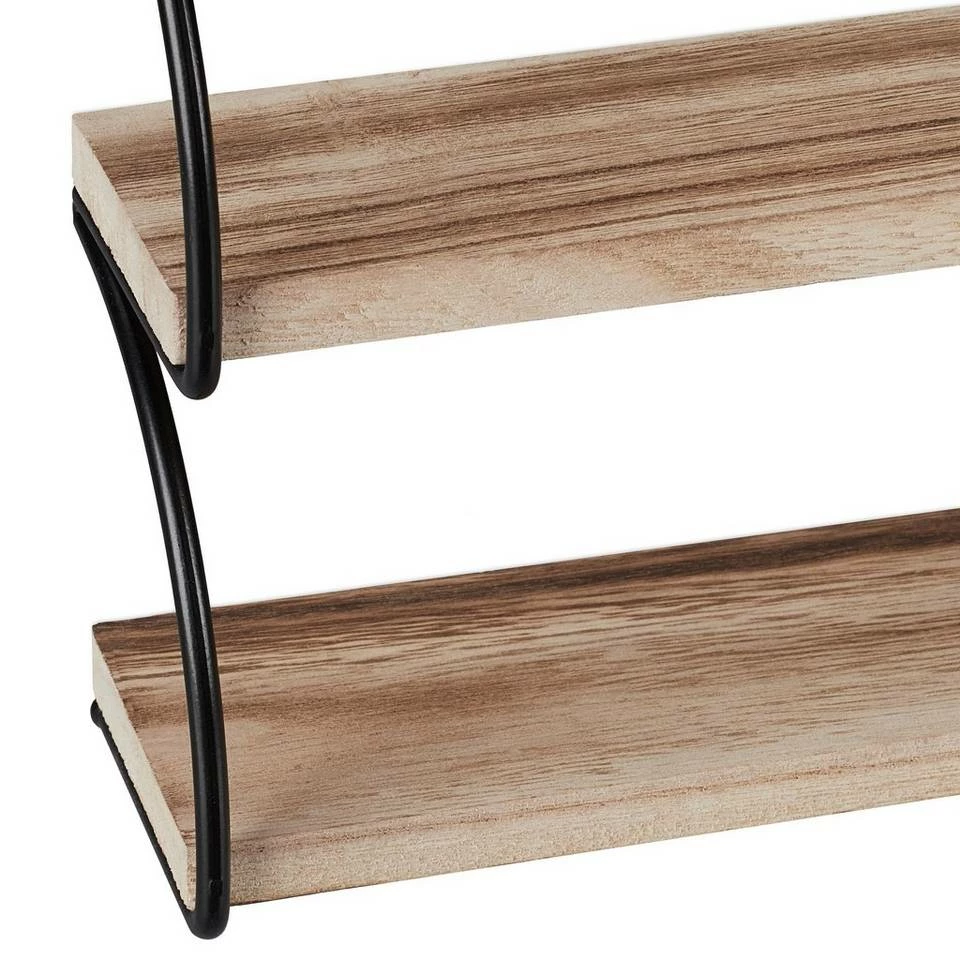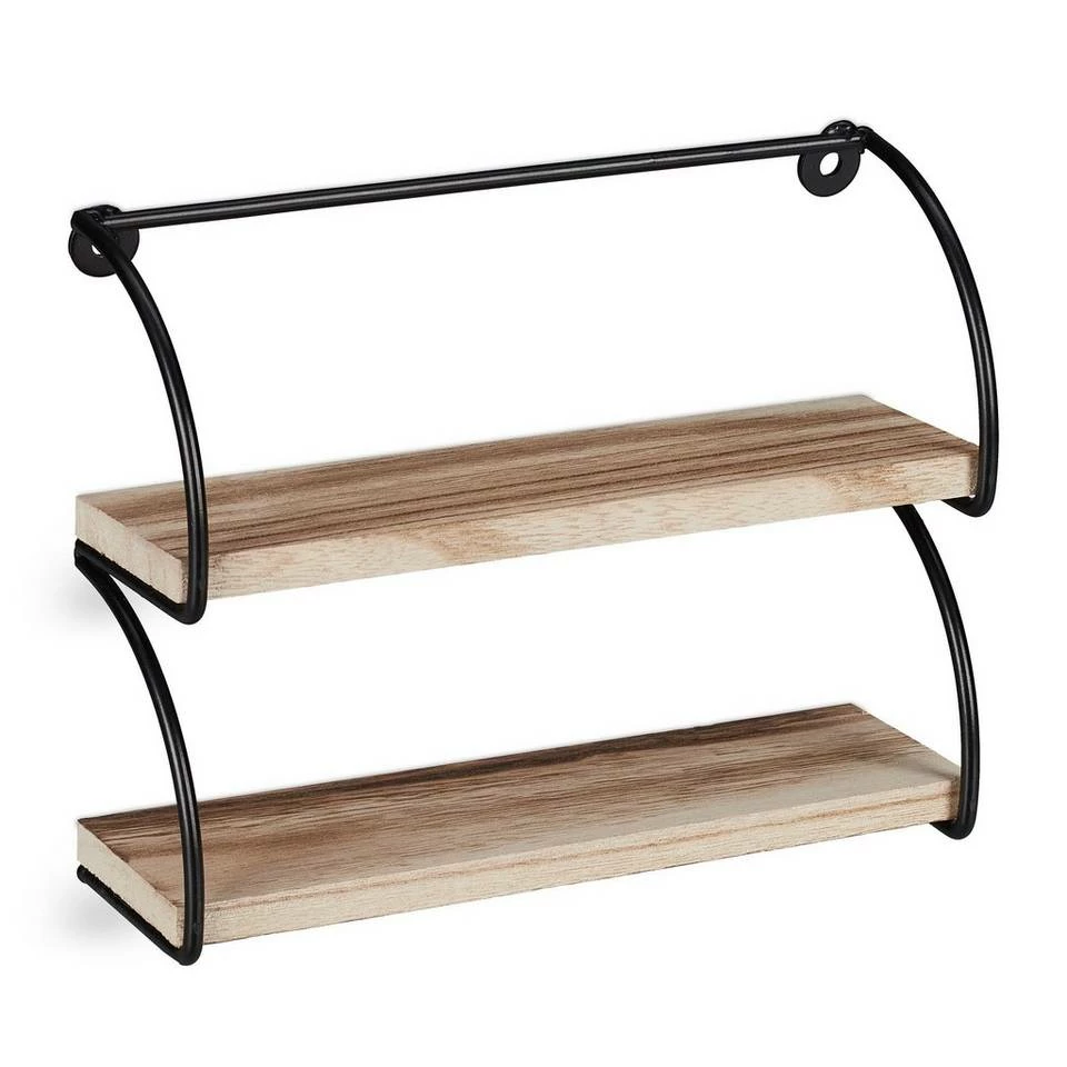 Dekoratives Wandregal mit 2 Ablagen Dieses kleine Wanddekoregal zeichnet sich durch sein schwarzes Metallgestell und die Ablagen in schicker Holzoptik aus und ist ein Blickfang an jeder Wand. Sein Industrial Stil fügt sich in Flur, Wohn- oder Schlafzimmer gleichermaßen ein und schafft dort Stellfläche für Figuren, Bilder, kleine Pflänzchen und andere Dekoobjekte. Auch als Gewürzregal in der Küche macht das Metall-Hängeregal eine ausgezeichnete Figur. Dank seiner geringen Größe passt es auch wunderbar an schmale Wände oder in kleine Nischen.