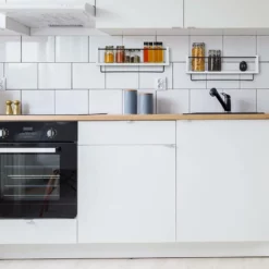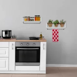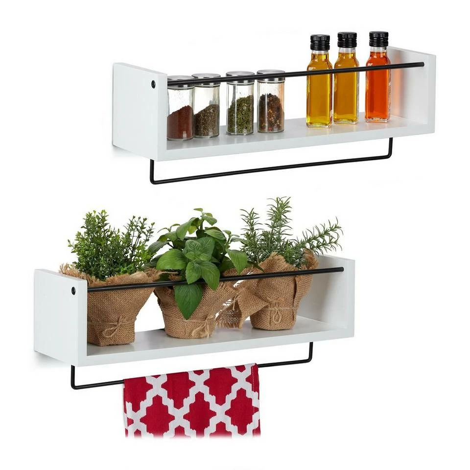 2 weiße Wandboards mit schwarzer Hängeleiste Auf Ihrer Arbeitsplatte stapeln sich die Gewürze und Küchenutensilien, sodass Sie kaum Platz für Kochen und Vorbereiten haben? Eine praktische Lösung sind diese Küchenregale für die Wand: Notwendige Vorräte und Gewürze sind immer griffbereit und übersichtlich sortiert. An einer Hängeleiste können Sie Ihre Kochlöffel und weitere Utensilien aufhängen. Die Küchenreling eignet sich auch gut als Handtuchstange. Die Wandmontage ist einfach und erfolgt mit den mitgelieferten Dübeln und Schrauben.