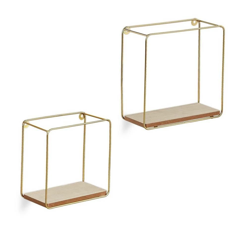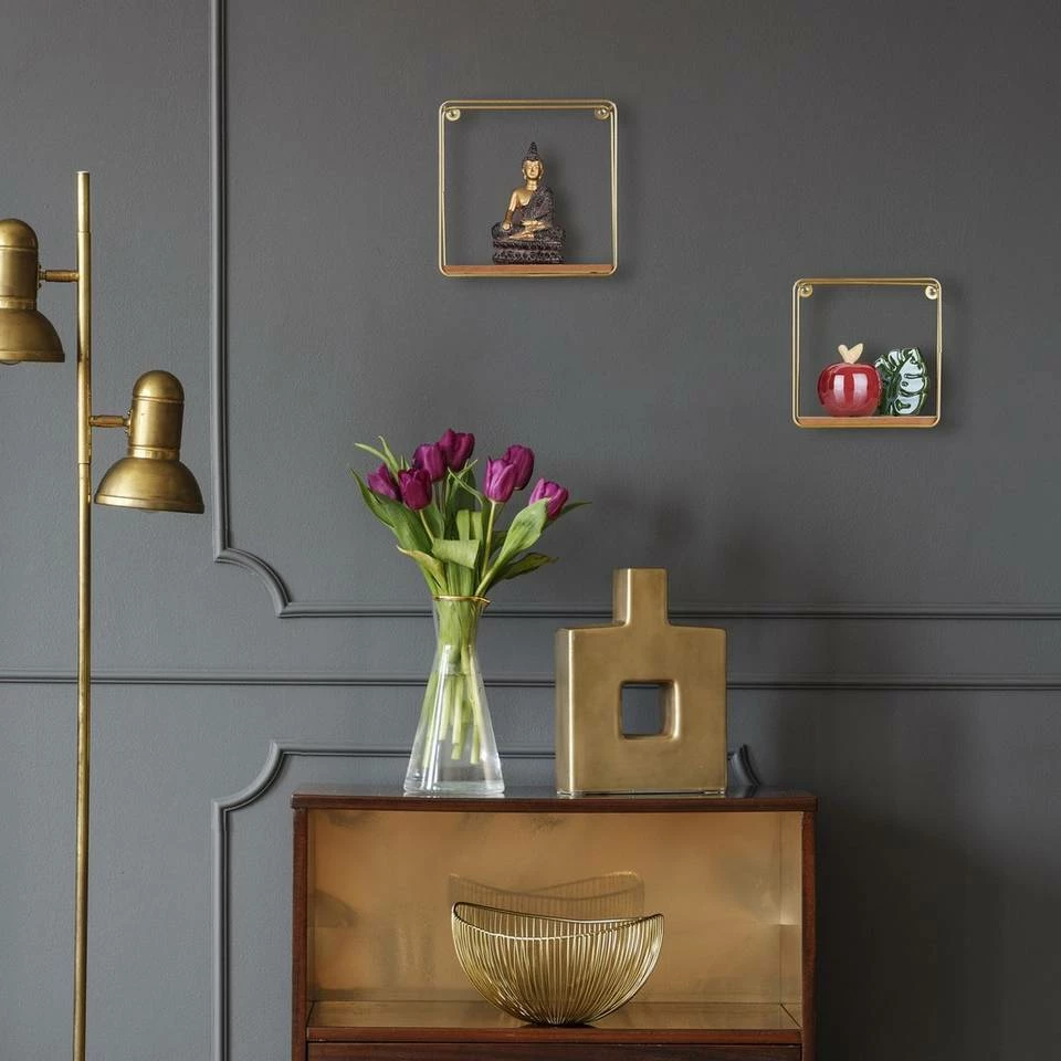 Quadratische Metallregale für die Wand Kleine Dekofiguren, Bilder oder Pflänzchen können Sie mit diesen geometrischen Schweberegalen wirkungsvoll präsentieren. Die goldenen Quadratregale begeistern mit ihrem filigranen Metallgestell und dem minimalistischen Design, das den Fokus gekonnt auf den Inhalt lenkt. Die kleinen Dekoregale im 2er Set passen in Wohnzimmer, Schlafzimmer, Flur oder Küche. Einzeln aufgehängt sind die Metall-Wandregale ebenso dekorativ, wie wenn Sie die 2 unterschiedlichen Größen gemeinsam arrangieren.