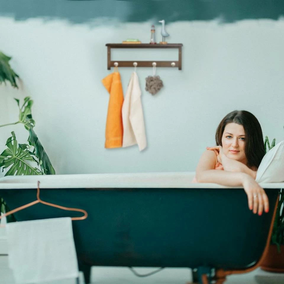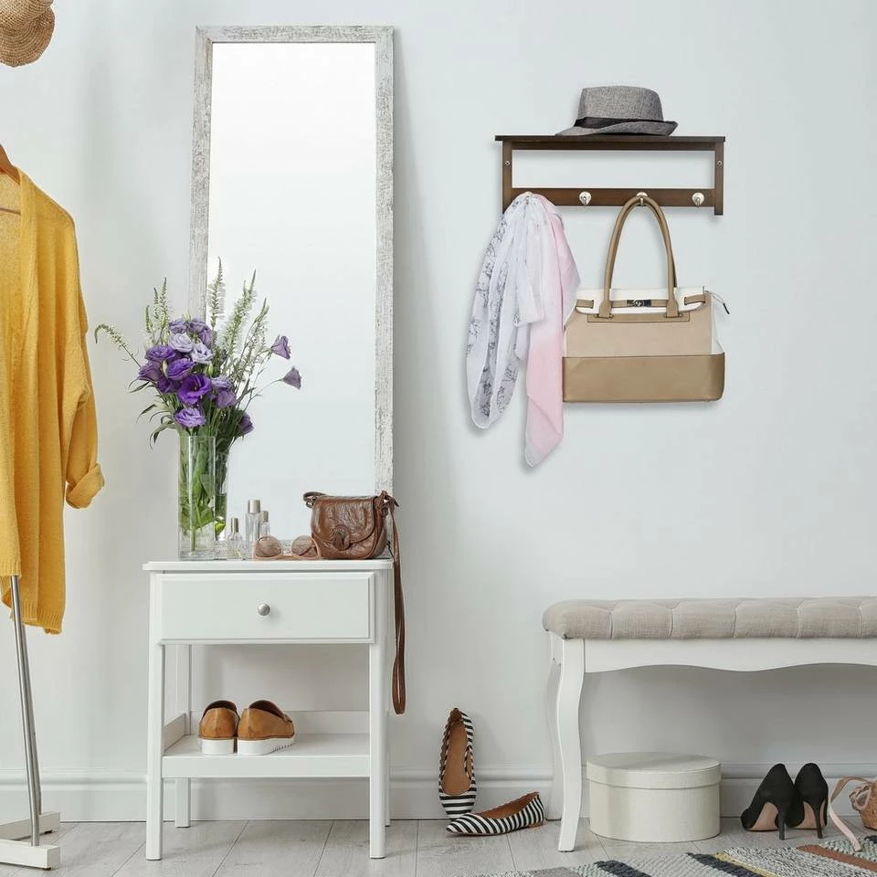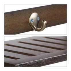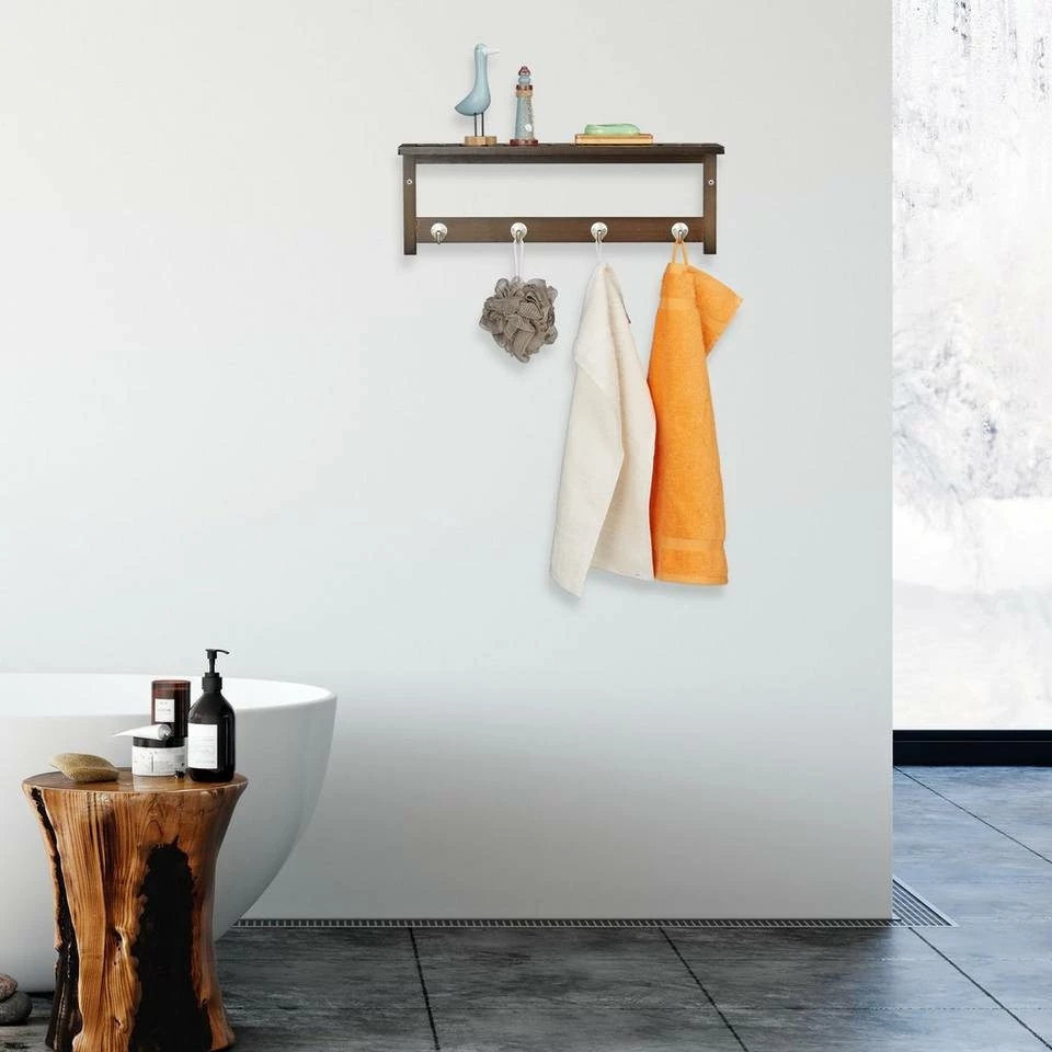 Dunkelbraunes Wandregal mit 4 Haken Das dunkelbraun lackierte Wandregal aus Bambus ist ein wahres Multitalent. Falls Sie im Badezimmer mal wieder nicht wissen, wo Sie mit all Ihren Utensilien hinsollen, schafft Ihnen das Schweberegal dank der Ablagefläche im Handumdrehen neuen Stauraum. An der Hakenleiste mit den 4 Metallhaken hängen Sie frische oder benutzte Handtücher auf. Der aus stabilem und feuchtigkeitsresistentem Holz gefertigte Handtuchhalter macht aber auch als Wandgarderobe im Flur eine gute Figur, an der Ihre Gäste ihre regennassen Kleider aufhängen können.