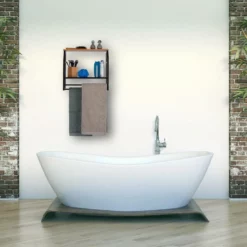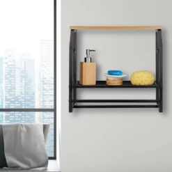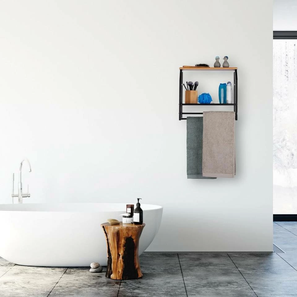 Stabiles Schweberegal für die Wand Wenn Sie keine Lust mehr auf kahle Wände haben und zusätzlichen Stauraum in Küche oder Bad gut gebrauchen können, ist dieses schwarze Hängeregal genau das Richtige. Das stablie Wandregal bietet zwei Ablagen und zwei Handtuchstangen in einer cleveren Aufbewahrungskombination. Die feinmaschige Gitterablage bietet Platz für Badartikel, Aufbewahrungsdosen und vieles mehr, die obere Ablage in Holzoptik bietet Fläche für Dekorationsgegenstände. Ihre Bade- und Handtücher können Sie mithilfe der beiden Stangen jederzeit griffbereit aufhängen.