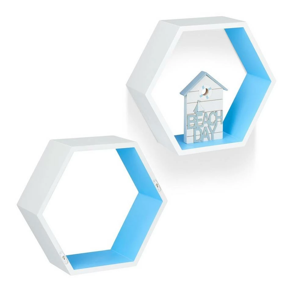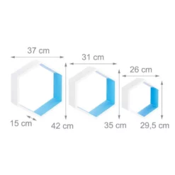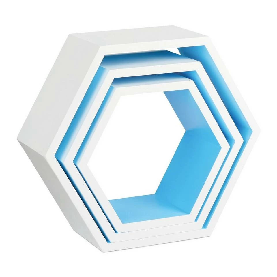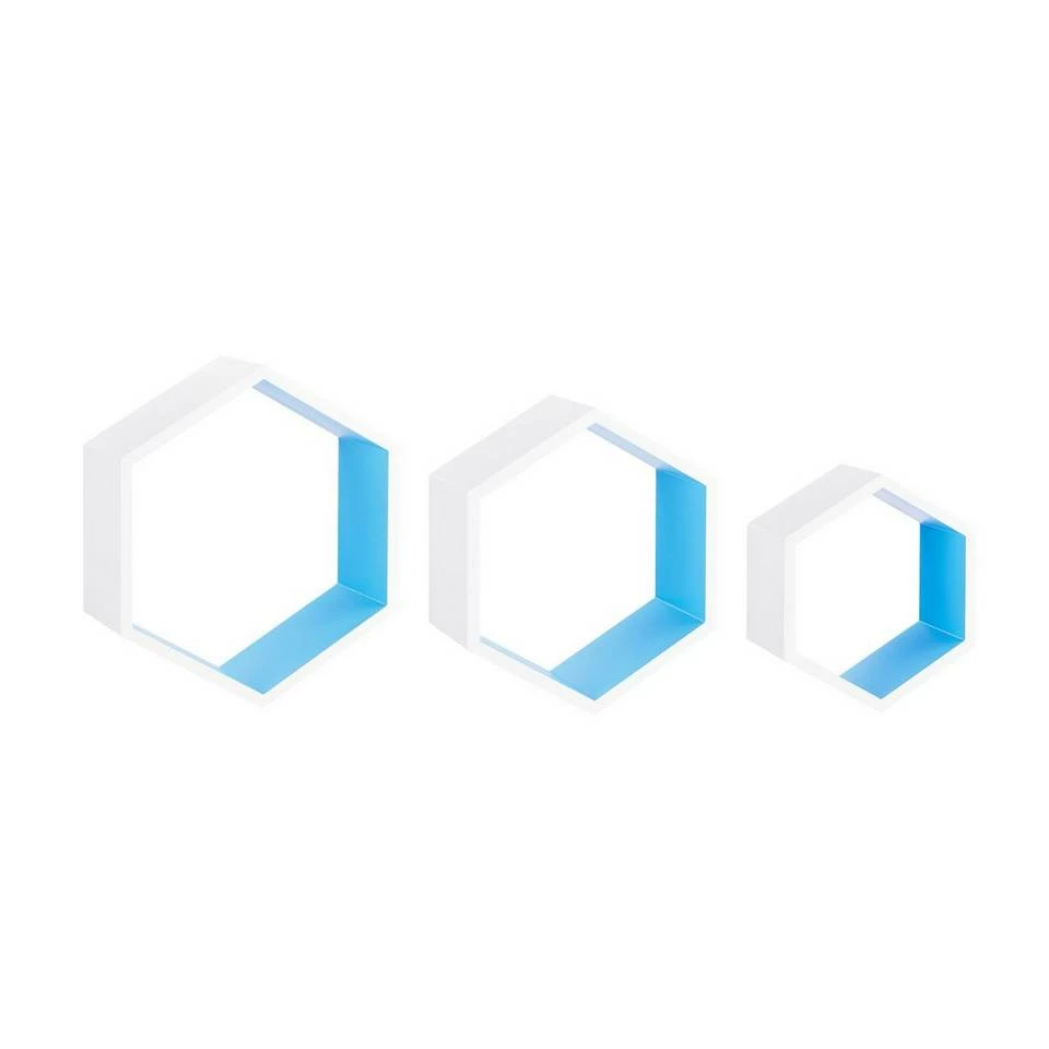 - Ein starkes Team: 3 sechseckige Wandregale in unterschiedlichen Größen – Weiß-blaue Farbvariante