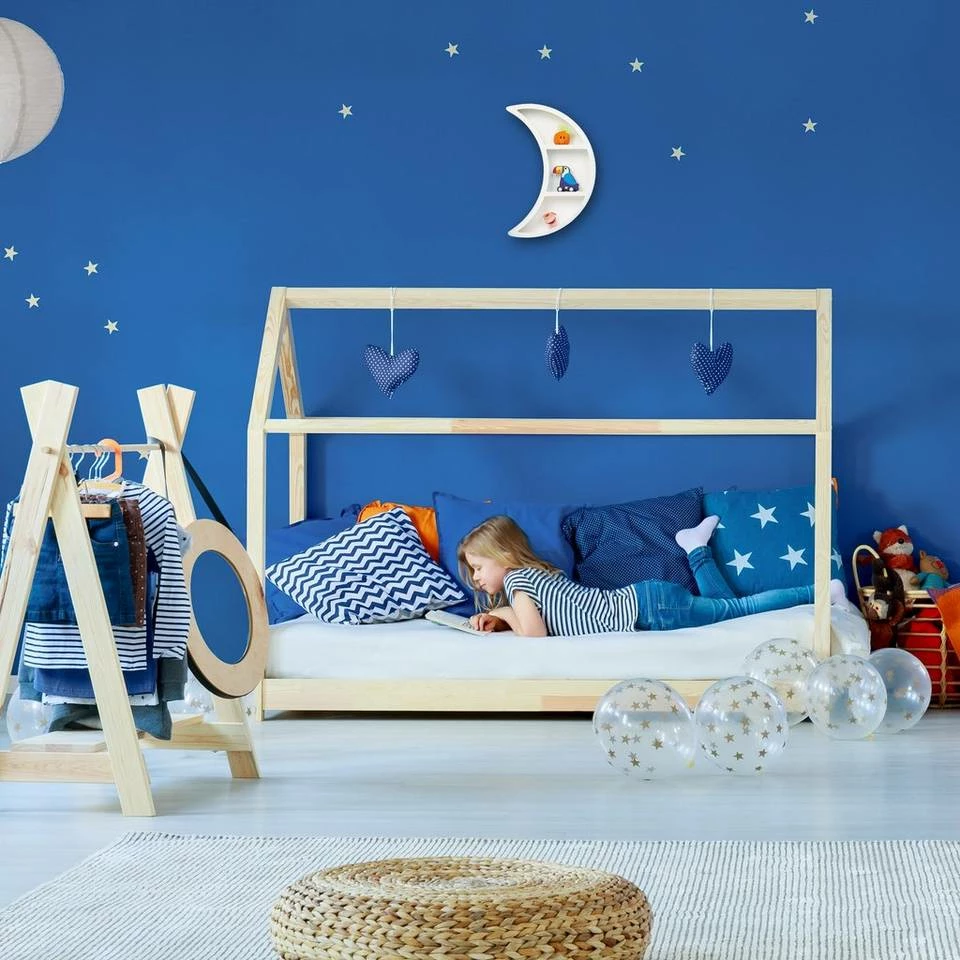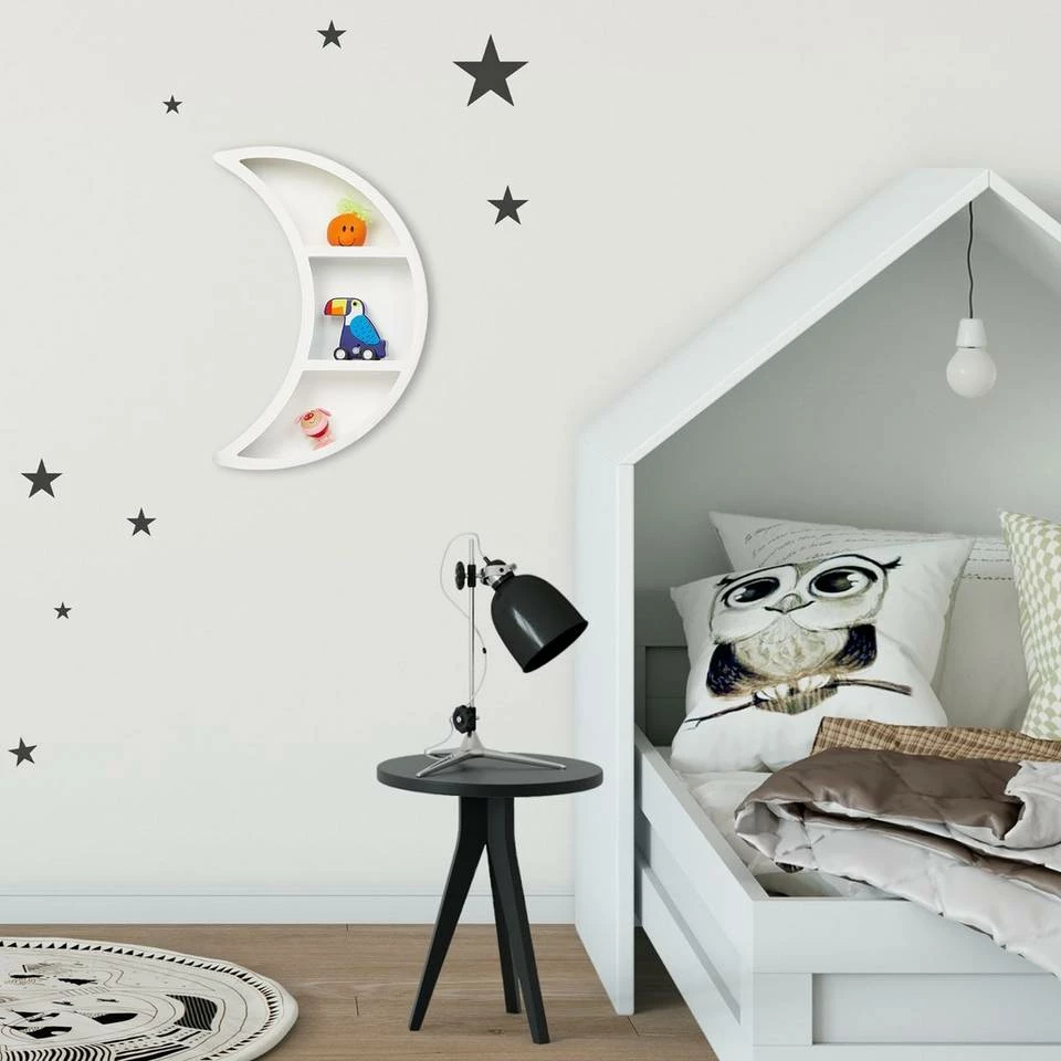 Dekoratives Mond-Regal für Wohn- und Kinderzimmer Mit dem weißen Mondregal hauchst Du leeren Wänden neues Leben ein. Im Wohnzimmer setzt das Schweberegal mit 2 Ablagen Dekoartikel und Souvenirs in Szene, im Kinderzimmer eignet es sich zur Präsentation von Spielfiguren. Dank der dekorativen Halbmondform ist das Hängeregal auch selbst ein absoluter Hingucker und verleiht Deinem Wohnbereich ein träumerisches Flair. Mit dem beiliegendem Montagematerial ist das Regal im Nu an der Wand befestigt.
